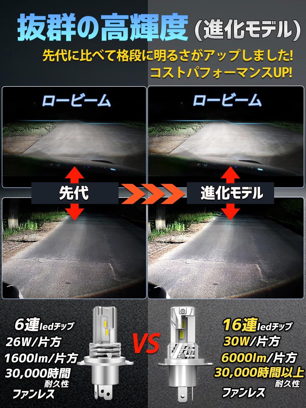 【爆光モデル・進化版】新型h4ledバルブは最先端32連チップ/片方を搭載しています。先代に比べて格段に明るさが向上しています。従来のledチップに比べて、安定性が大幅に向上し、発光効率が99%に達しました。チップ寿命が抜群で、光の衰えを抑えます。ノイズ対策のファンレス設計、爆光を実現したledヘッドライトです。お客様にはHID級の明るさをお楽しみいただきます!