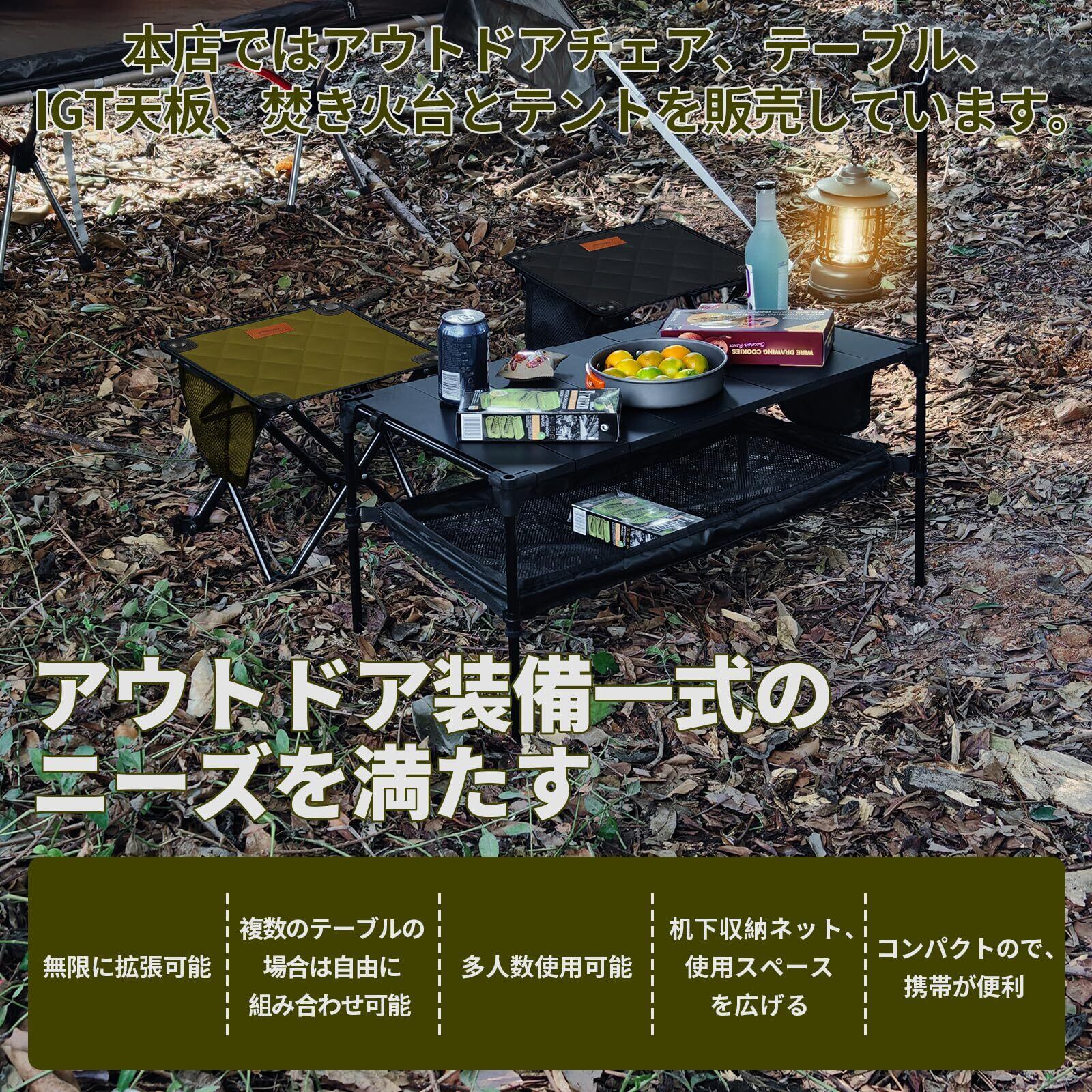 【目を引くディテール】:◆【傷・熱に強いカーボンスチール製天板】焚火台から火の粉が飛んでも傷付きにくく、アウトドアに最適。◆【小物入れに役立つ収納ネット】テーブル下収納として便利なネット棚。小物や食器など、使いたいときにすぐ取り出せます。◆【サイドポケット】スマホ、メガネなどのものを入れることができます。◆【ランタンスタンド】ランタンやランプを吊るして周囲を明るく照らせるランタンスタンド付き。夜間のキャンプでも快適に過ごせます。