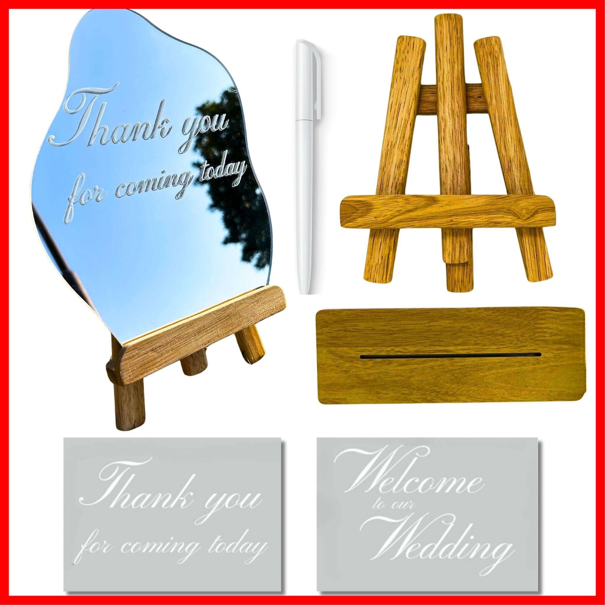 (コンプリートセット)このセットには、ウェーブ形状のミラー1枚、2種類の転写シール、2種類のスタンド、ホワイトペン、そして、説明書が含まれています。これらのアイテムを組み合わせることで、自分好みにカスタマイズできます。転写シールには「Welcome to our Wedding」と「Thank you for coming today」の2種類があります。さらに、付属のホワイトペンで日付や名前を書き入れることで、世界に一つだけのウェルカムボードを作成できます。