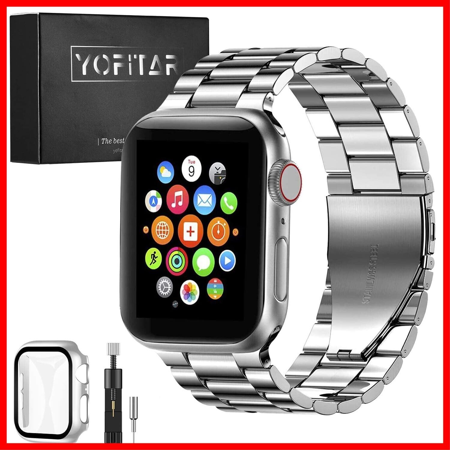 [YOFITAR] for Apple Watch バンド 保護ケース付き ステンレス製 アップルウォッチ 交換ベルト Apple Watch Ultra 2/Ultra/10/9/8/7/SE2/6/SE/5/4/3/2/1対応 iWatch バンド Apple Watchアクセサリ 長さ調整器具付き(44mm,シルバー)
