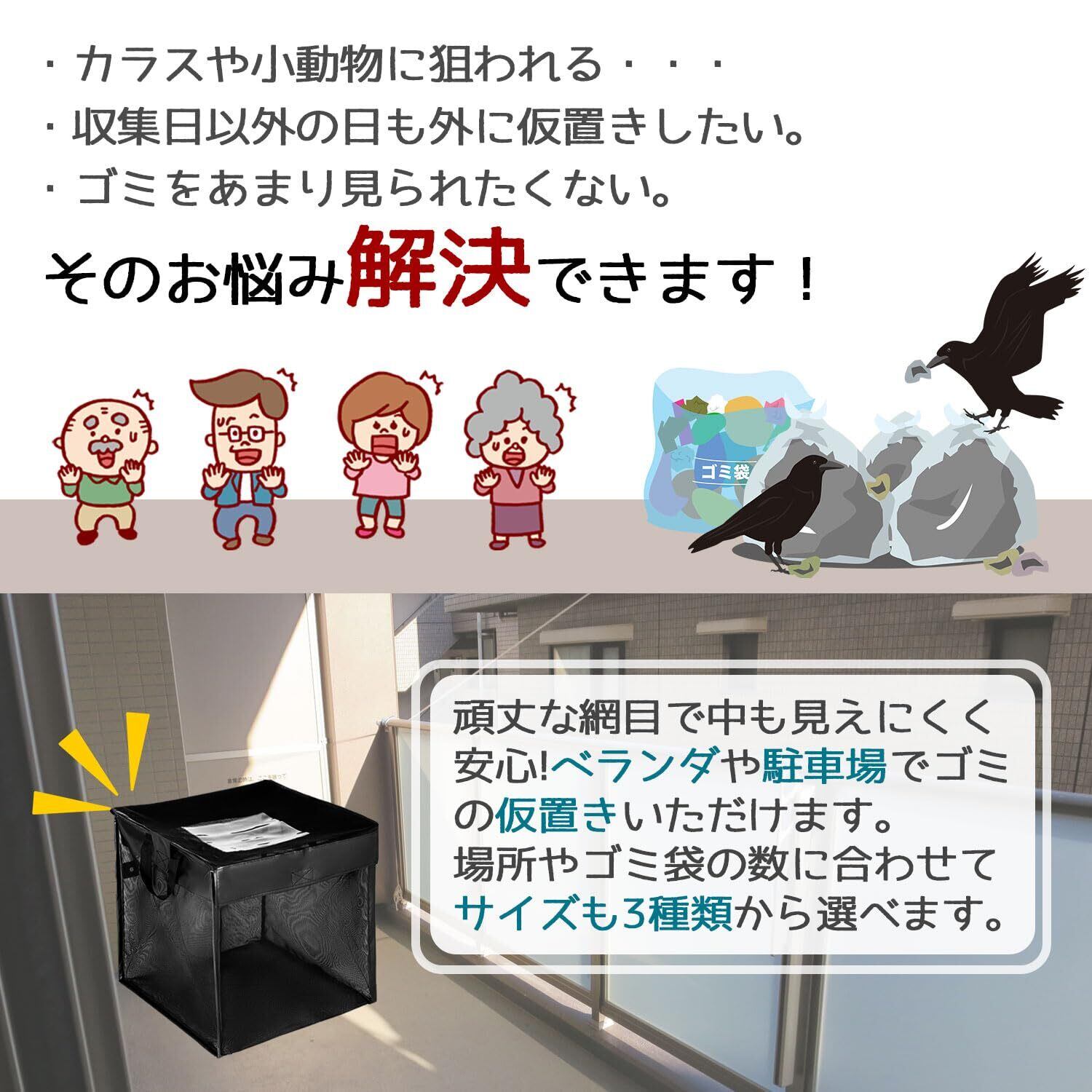 【90Lサイズ】 45リットルのゴミ袋1~2個分収納可能、また、戸別収集用のほか、ベランダや玄関先などで一時置きに使用することもオススメです。【コンパクトに折りたためる】 こちらのごみネットボックスは折りたたんで収納が可能! 使わないときは折りたためるので、収納場所にも困りません。 設置も収納も慣れれば楽チン。