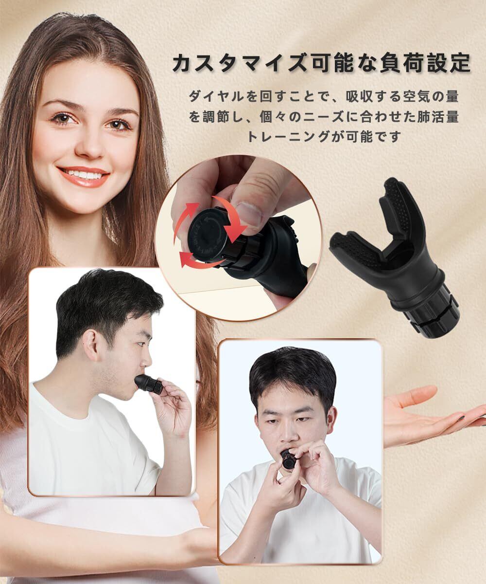 【カスタマイズ可能な負荷設定】ダイヤルを回すことで、吸収する空気の量を調節し、個々のニーズに合わせた肺活量トレーニングが可能です。初心者から上級者まで幅広く対応し、徐々にレベルアップしていくことができます。