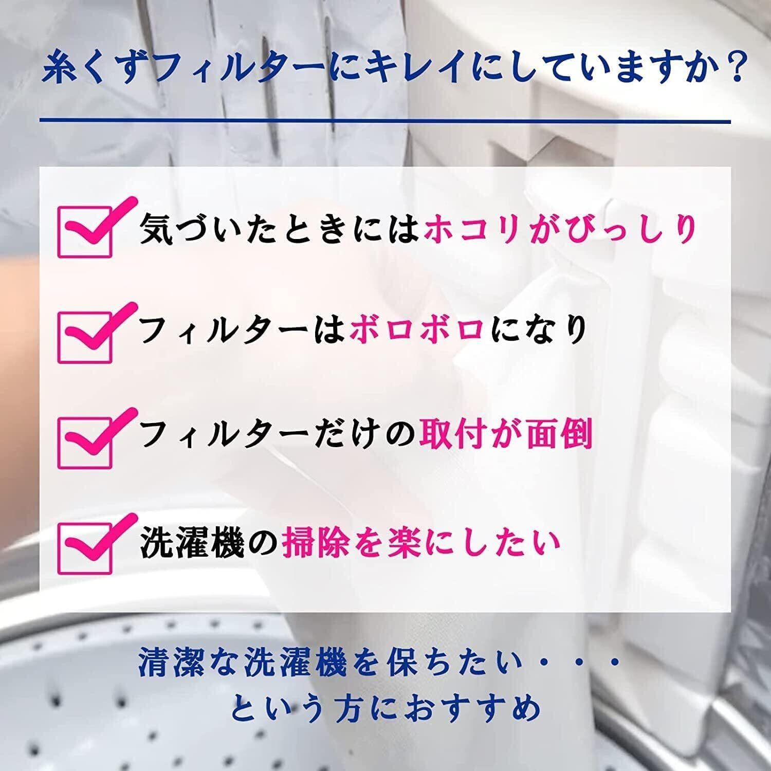 『特徴』 ① 【高品質素材】耐久性のあるマイクロファイバー素材で作られており、長期間の使用にも耐えられます。 ② 【効果的なフィルタリング】 糸くずや髪の毛、ペットの毛などを効果的にキャッチし、洗濯物を清潔に保ちます。 ③ 【洗濯機寿命延長】 フィルターが糸くずやゴミをキャッチすることで、洗濯機のドラムや排水口への負担を軽減し、寿命を延ばします。 ④ 【環境に優しい】繰り返し使用できるため、使い捨てフィルターよりも環境に優しい選択です。