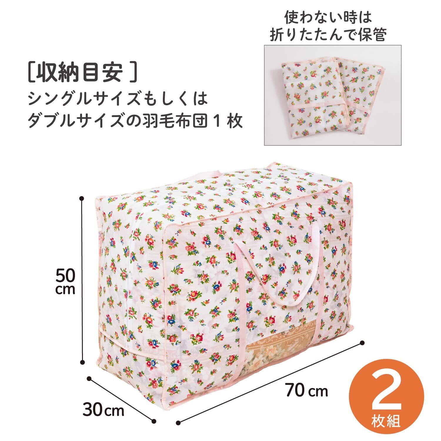 【商品仕様】:サイズ/約幅70×奥行30×高さ50cm(持ち手除く)、カラー/ホワイト、柄/小花柄、内容/2枚、収納目安(袋1枚あたり)/シングルサイズもしくはダブルサイズの羽毛布団1枚、材質/ポリプロピレン・ポリエチレン
