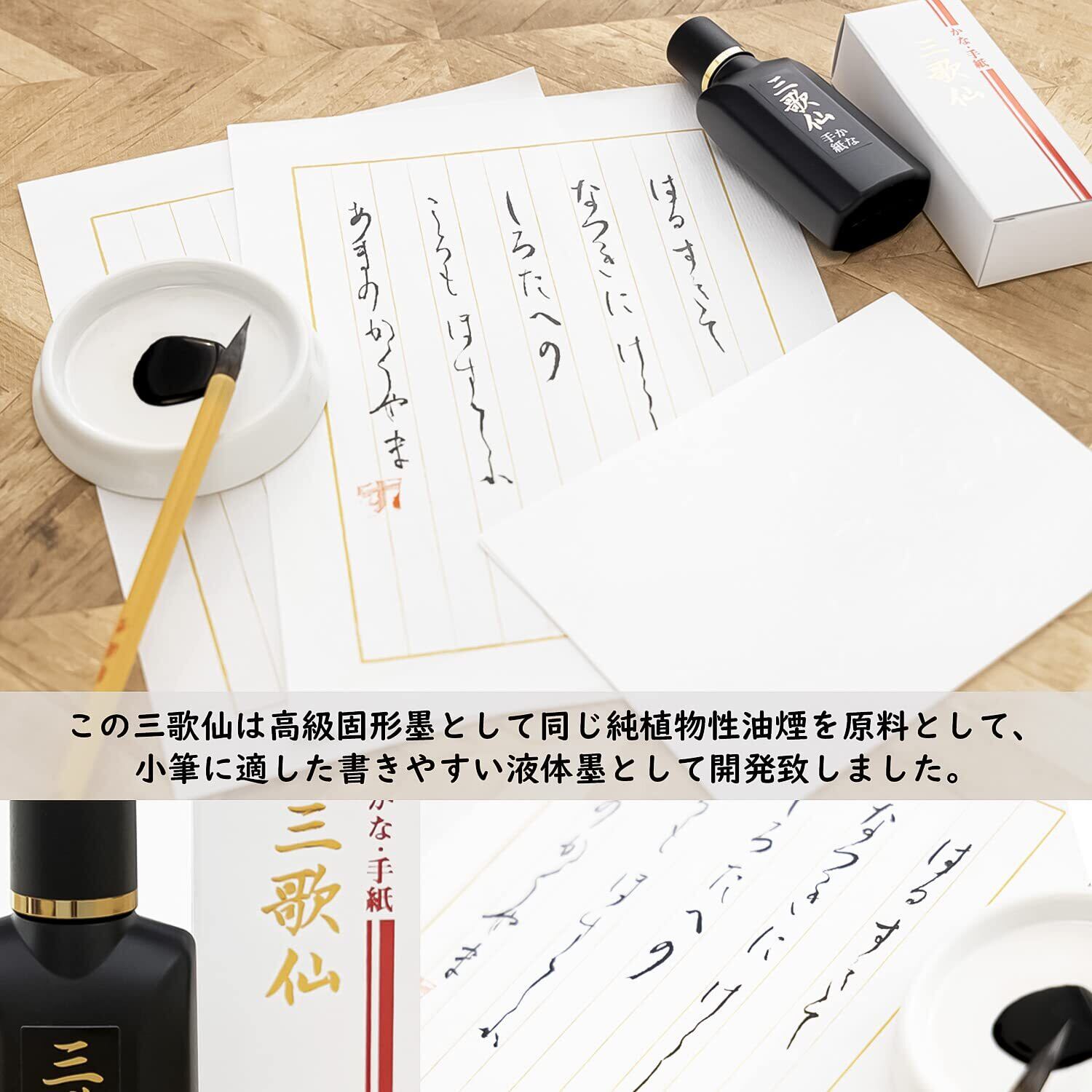 【三歌仙】 高級固形墨と同じ植物性油煙を原料として、小筆に適した書きやすいよう開発された液体墨