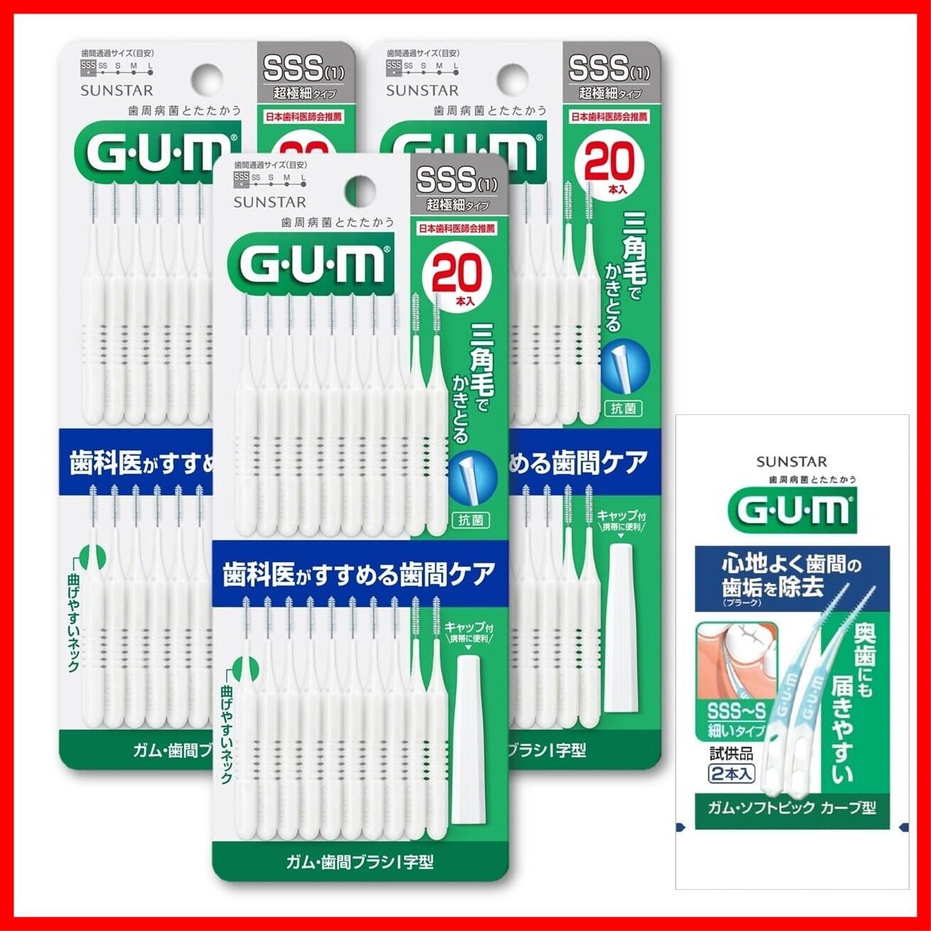 GUM(ガム) 歯間ブラシ I字型 ワイヤータイプ [サイズ:SSS (1)] 20本入×3個パック+おまけ付き