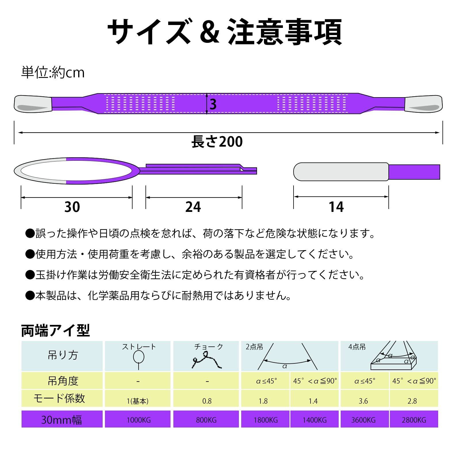 【商品仕様】■全長:2M ■ベルト幅:30mm ■紫 最大使用荷重:1000kg (ストレート吊の場合) ■安全係数:7