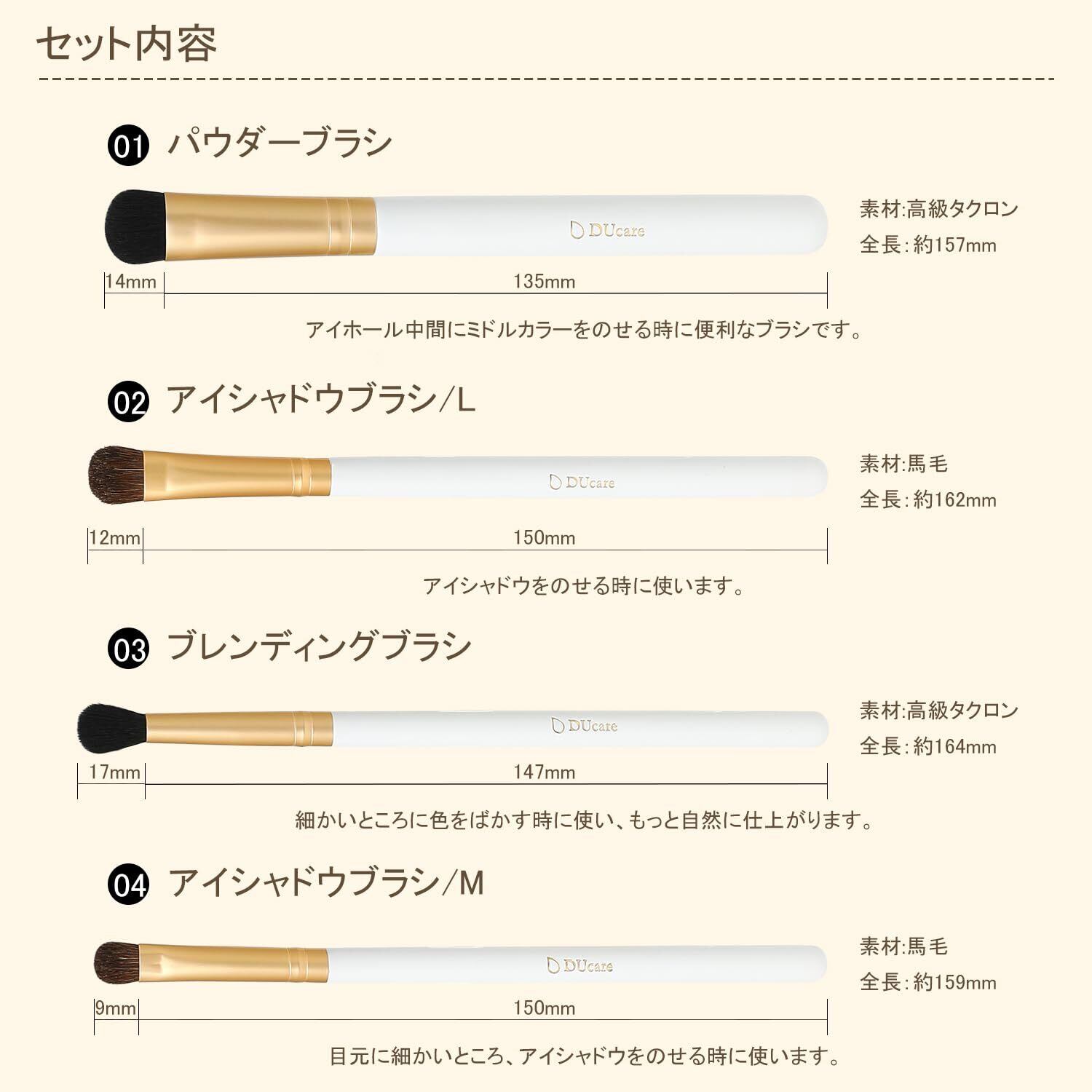 【ポニーの毛&高級タクロンを使用】天然毛の中で一番アイシャドウブラシに適しているのが、ポニーの毛です。柔らかくて弾力性に富んでおり、発色に優れていて繊細な目元を傷つけない。アイブロウブラシなどは、適度なこしが必要なため、柔らかいがこしがあってなおかつ耐久性のある高級タクロンを使用。