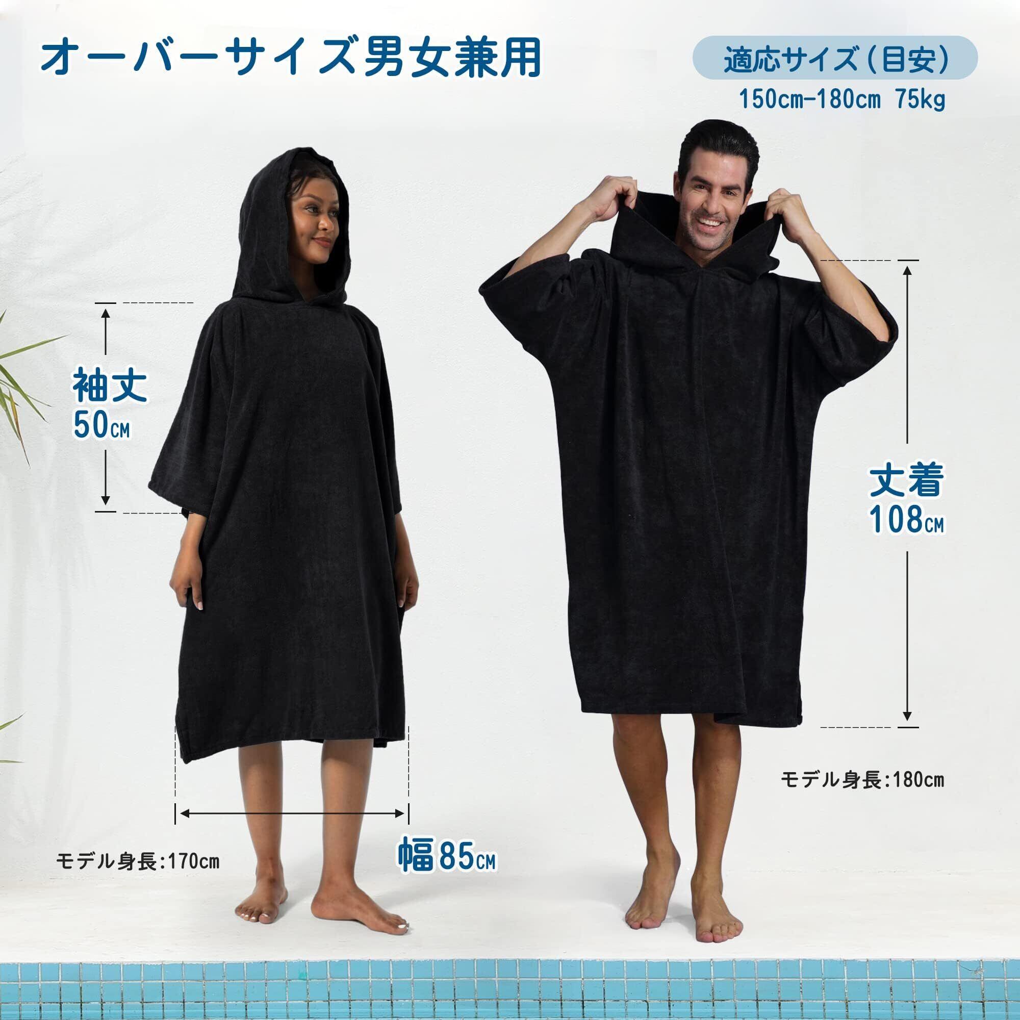 【機能性】シンプルなデザインで抜群の吸水性が備えております。ポケットは片側のみ1個付き、もう片側は中に手を入れられるスルーポケットが1個付き、ポケットや無駄な装飾を省いた現役サーファー考案の実用的な着替えポンチョタオルです。