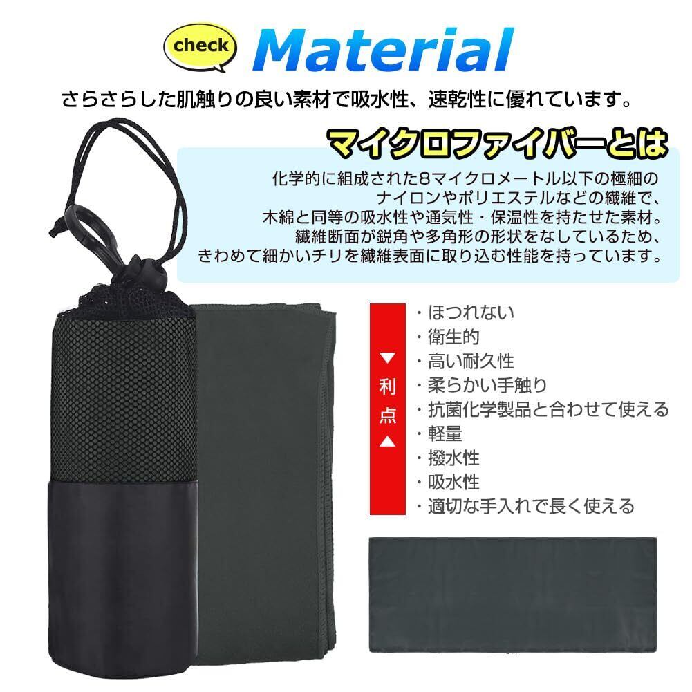 【超吸水・速乾・抗菌】見た目が薄くても吸水性に優れ、タオル専用のふわふわなマイクロファイバー繊維を使った吸水速乾タオル。極細繊維で肌触りもシルキーです。抜群の吸収力のうえ、軽くて肌触りも良く、耐久性も優れています。カビを防ぎ抗菌処理を施しました、汗を吸っても安心、濡らしたタオルに雑菌が繁殖するのも防いでくれます。
