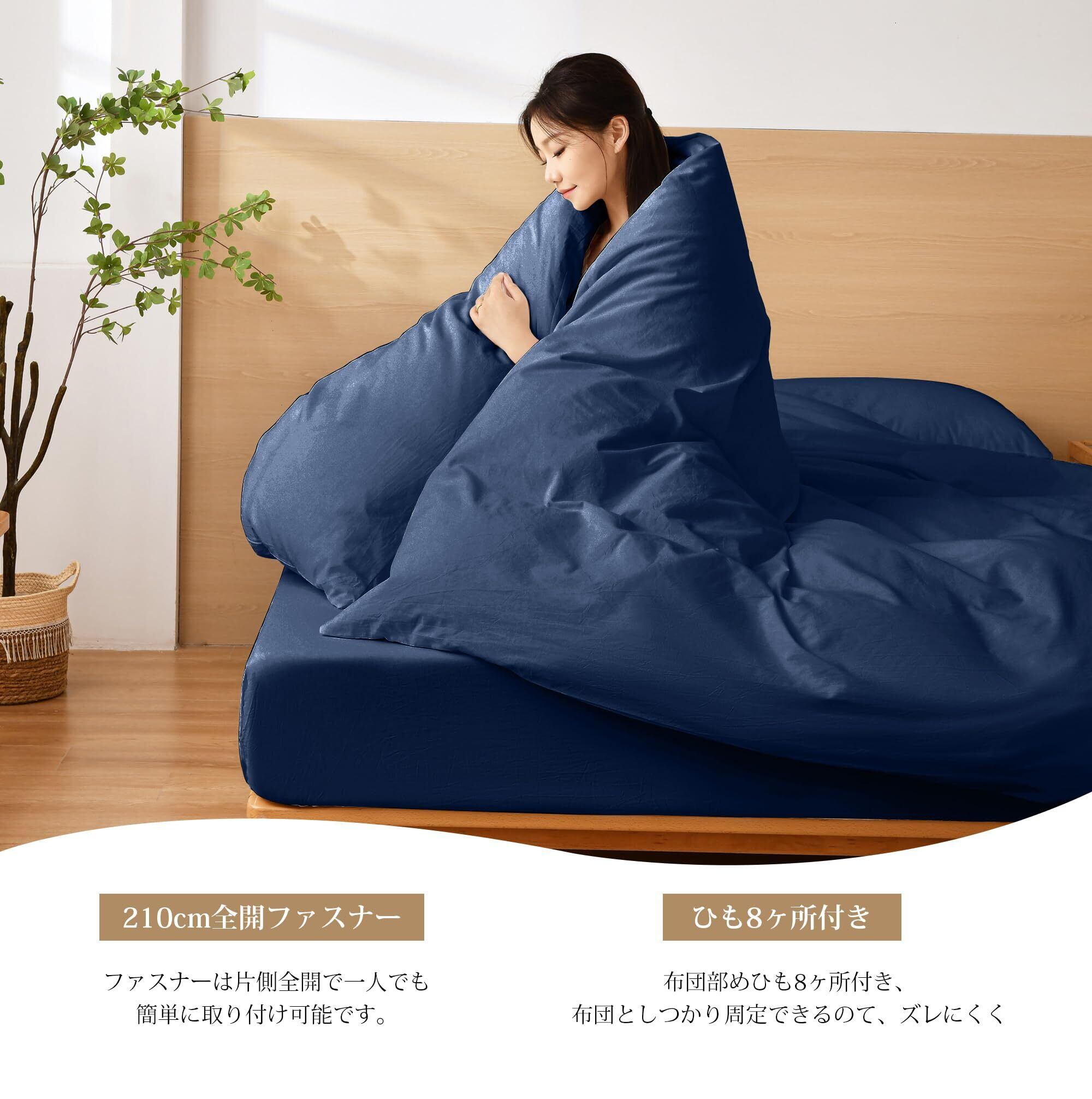 AYO 寝具カバーセット 布団カバーセット 洗いざらし シワ加工 水洗い やわらか (掛け布団カバー ボックスシーツ 枕カバー)吸水速乾 丸洗いOK 肌に優しい 無地 シンプル オールシーズン(シングル・3点セット ネイビー)