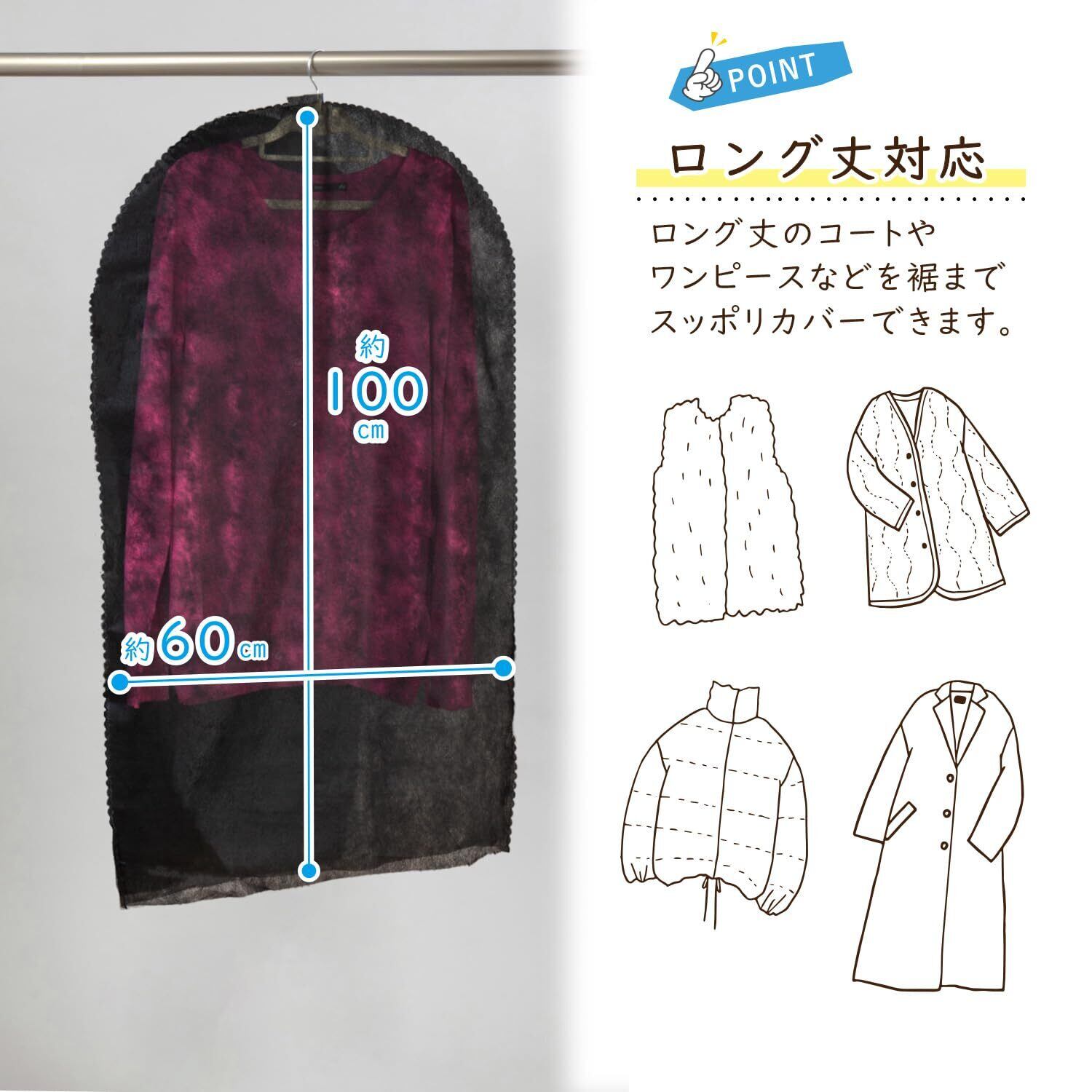 【洋服の毛玉や傷みを防ぐ・丈の長さを調節できる】:カバーを掛けておくことで保管中に洋服同士が擦れず、毛玉の発生や傷みを防げる。カバーの裾をハサミでカットすることもできるので、洋服の長さに合わせて使える。