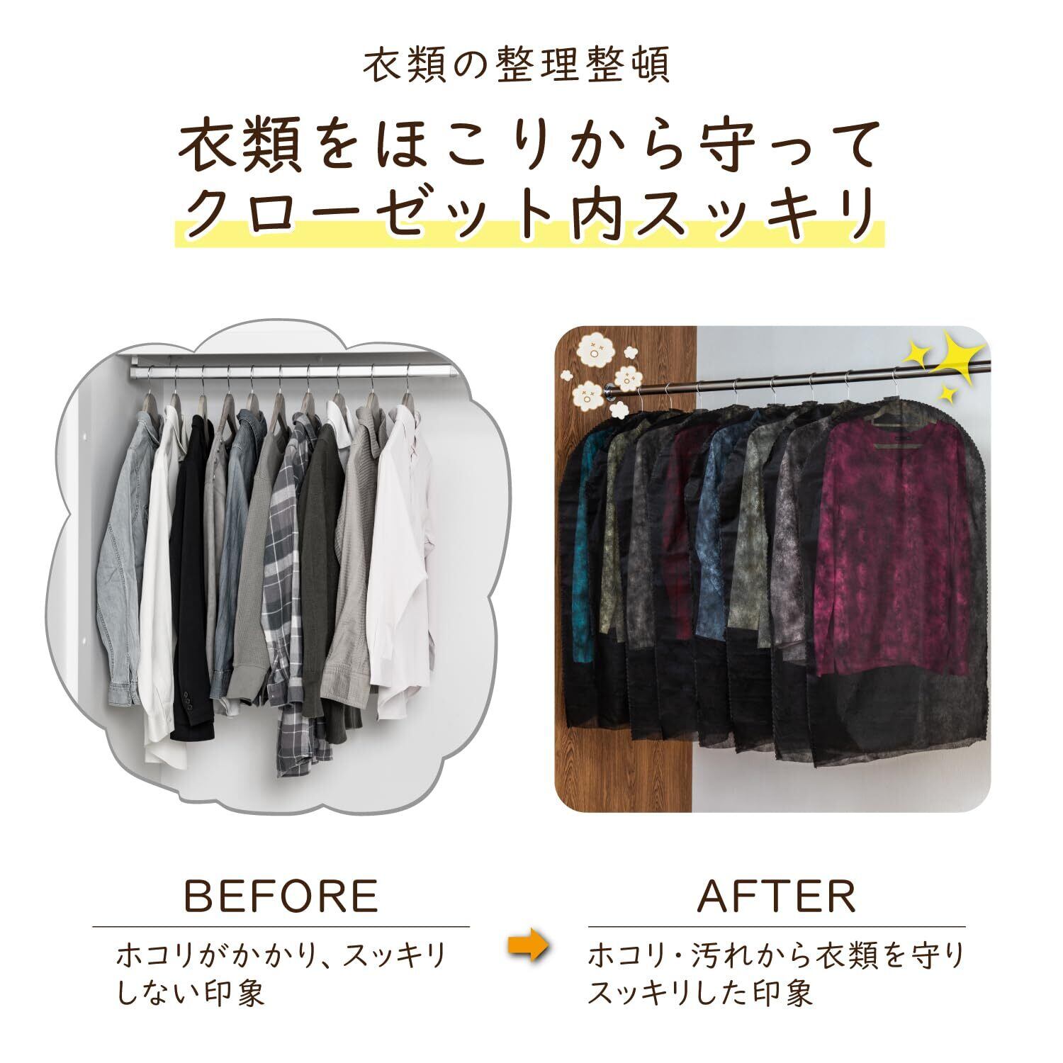 【オフシーズンの洋服や礼服などをホコリから守る】:オフシーズンの洋服やジャケット、普段着用しない礼服などをホコリから守り保管。