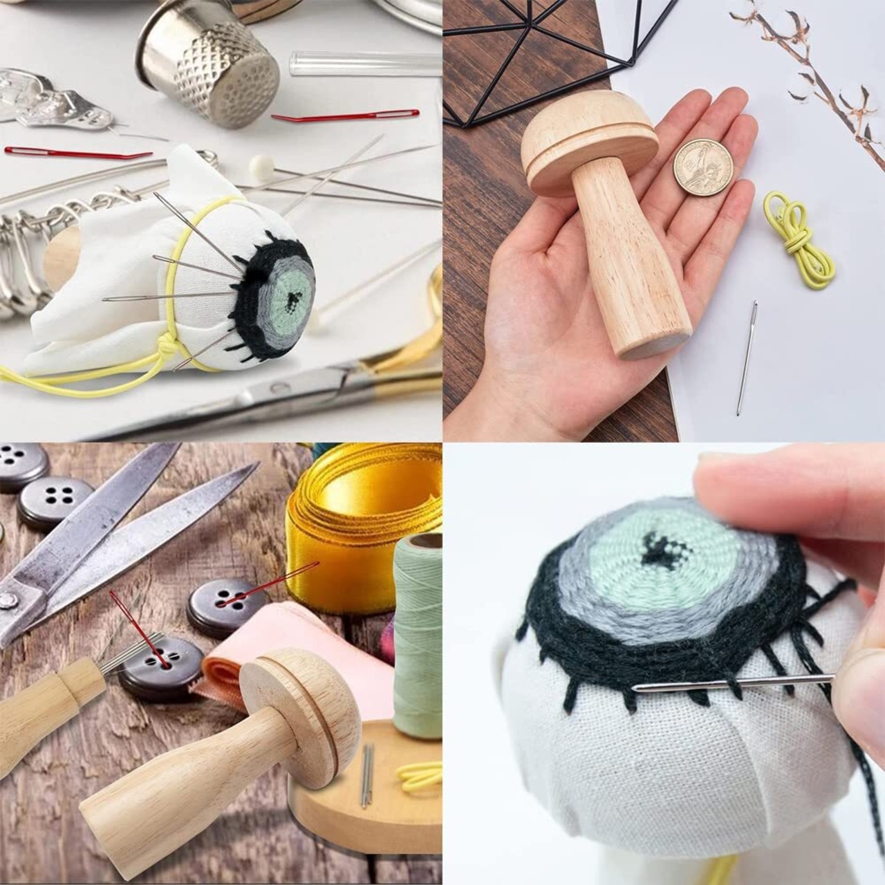 【マッシュルームのデザイン】マッシュルームの形状は、握りやすく、手首へのストレスを軽減するように設計されており、非常に実用的なダーニングツールです。伸縮性のあるコードを使用して縫製位置を固定し、縫製時の滑りを防ぎます。