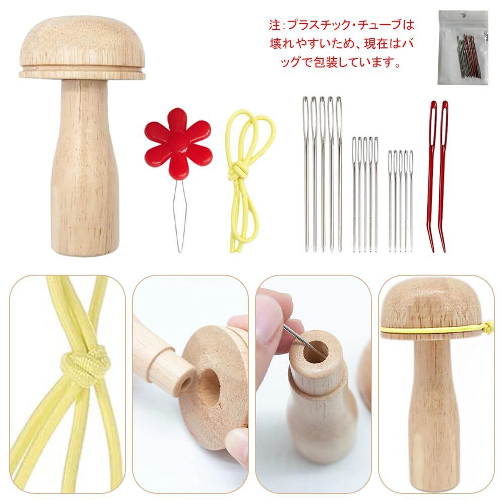 【繕い道具セット】原木のマッシュルーム×1、30cmイエローゴム筋×1、梅花形穿线器×1、5.2cmの大きなアイピン×5、6cmの大きなアイピン×5、7cmの大きなアイピン×5、7cmラージアイアルミ曲げ針×2。