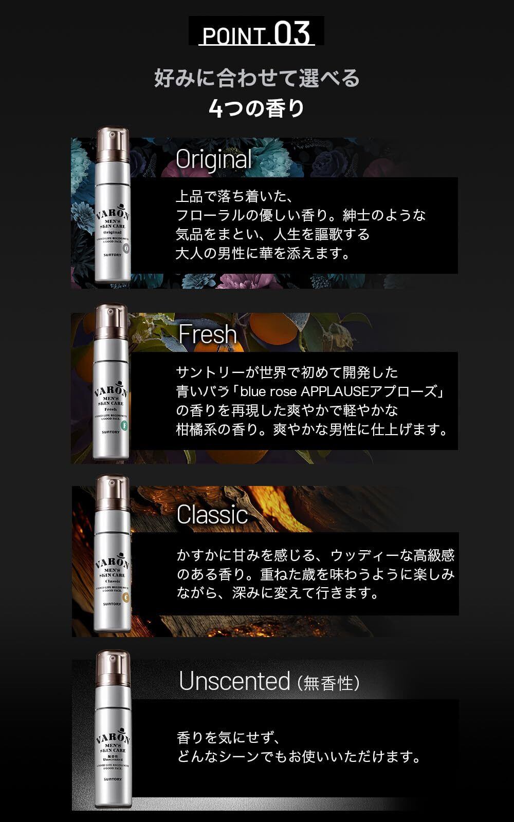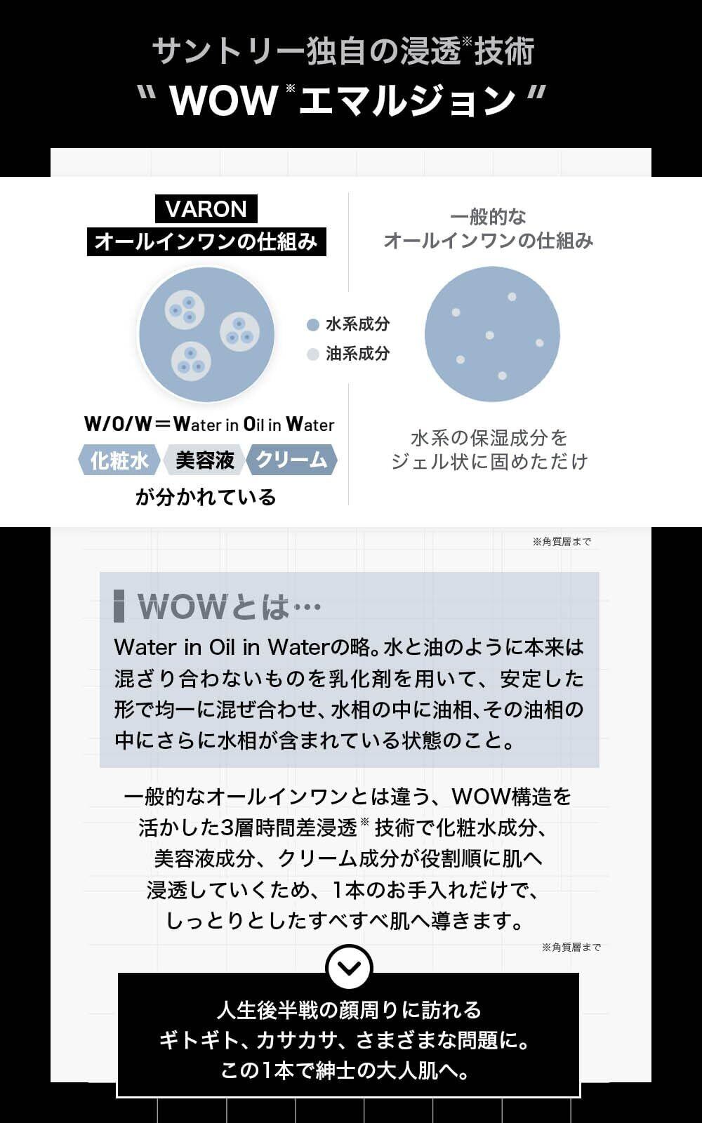 【おすすめする理由3:紳士の大人肌へ導く独自の3層時間差浸透※技術を採用】サントリーは独自の技術「WOW*エマルジョン」で、安定させることが難しかったWOW*(水相・油相・水相)構造を実用化しました。VARONは、他の一般的なオールインワンとは違う、WOW構造を活かした3層時間差浸透※技術で化粧水成分、美容液成分、クリーム成分が役割順に肌へ浸透していくため、1本のお手入れだけで、しっとりとしたすべすべ肌へ導きます。※独自の3層構造により成分を3段階で角層に届けること