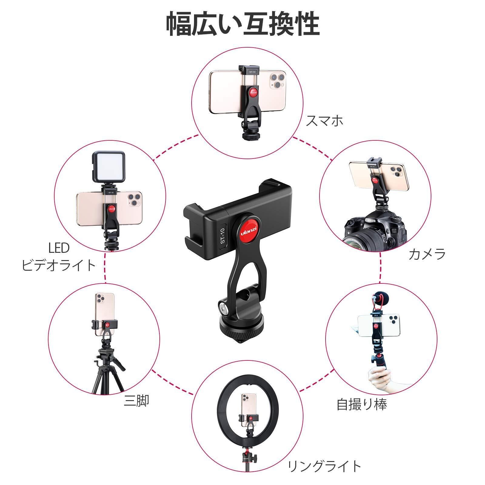 コールドシューマウント--- ST-10スマホスタンドには、ユニークなコールドシューマウントデザインにより、マイク、ビデオライト、その他の機器を固定できるスマホ三脚マウントです。