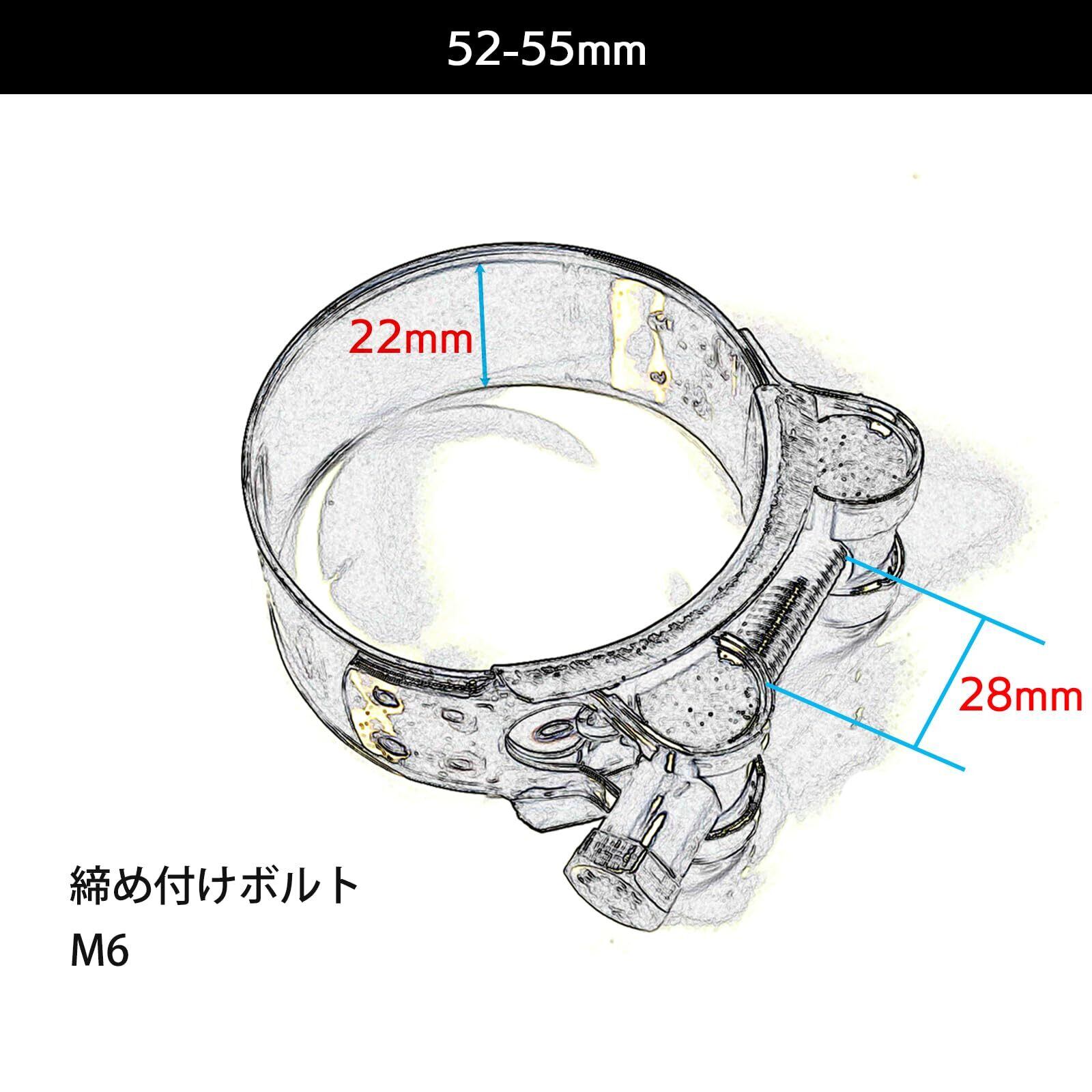汎用品として販売されており、48-51mm、52-55mm、60-63mmのサイズ展開があり、さまざまなマフラー径に適応します。バンド幅は22mm、締め付けボルトはM6規格で長さ60mm。取り付け時の調整余裕も約3mm確保されているため、スムーズな設置が可能です。ボルトを締めることで簡単に固定でき、初心者の方でも手軽に取り付けられます。