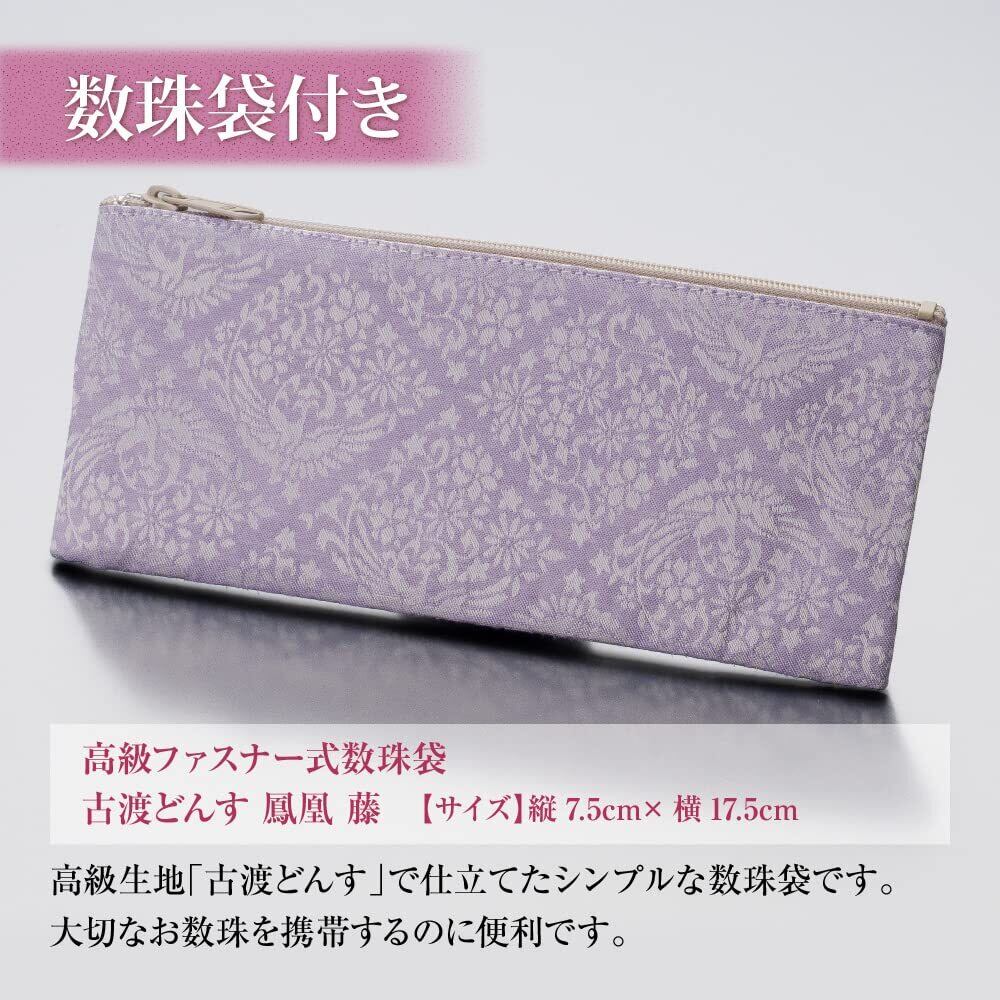房は京都の伝統工芸である「京房ひも」の職人が製作した正絹頭付房を使用しております。小さいバッグにも収まりやすいコンパクトサイズの高級ファスナー式数珠袋をお付けします。
