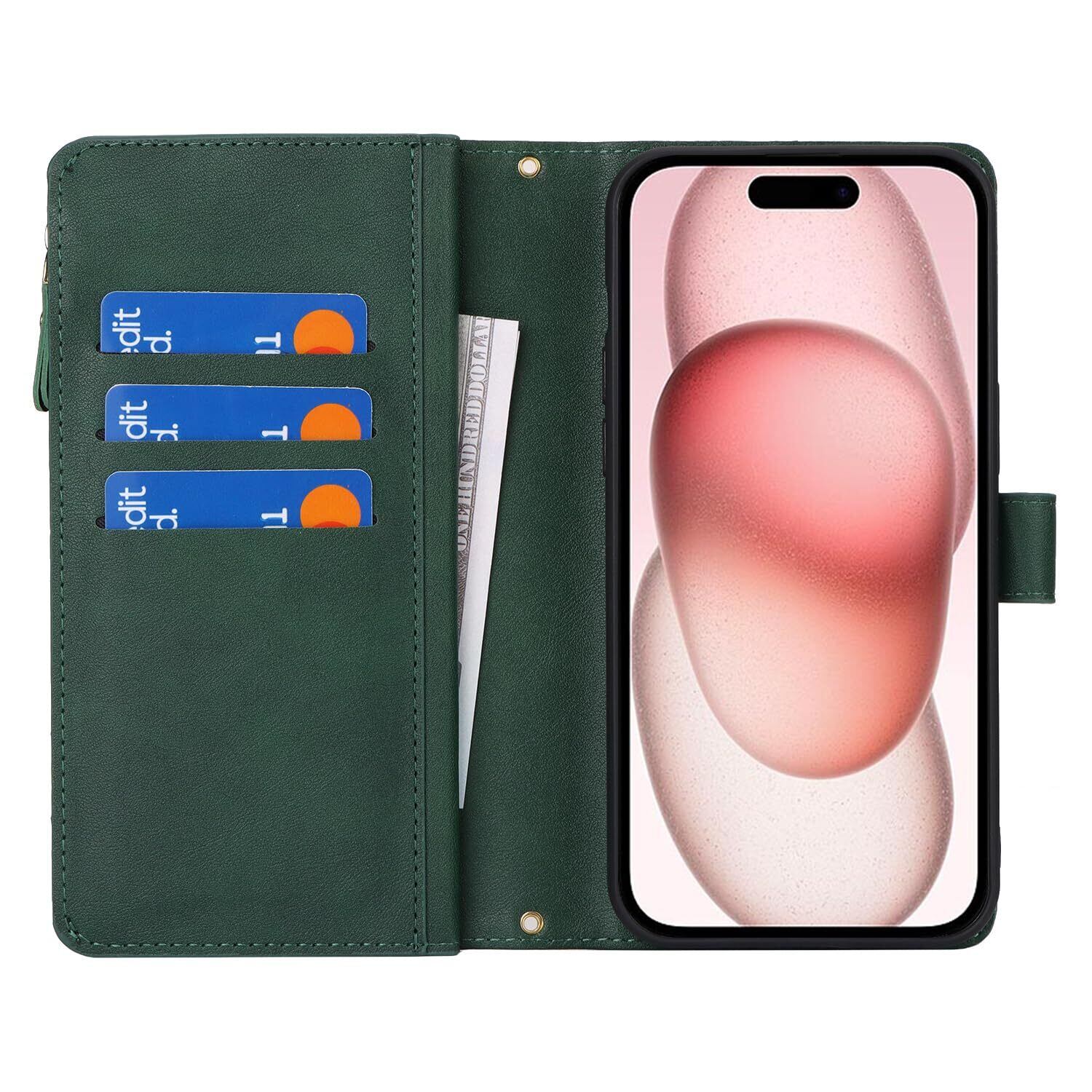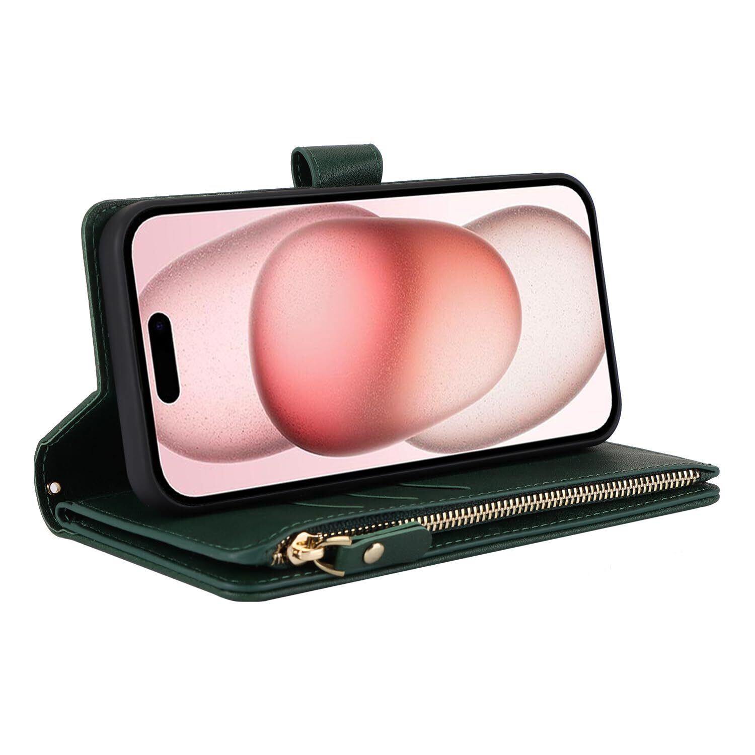 Eastwave アイフォン 15 ケース For iPhone 15 縄掛けケース For iPhone15 手帳型 財布型 ICカード コインポケット ストラップ付き カード 収納 小銭入れ ファスナーポケット付き PUレザー 6色グリーン