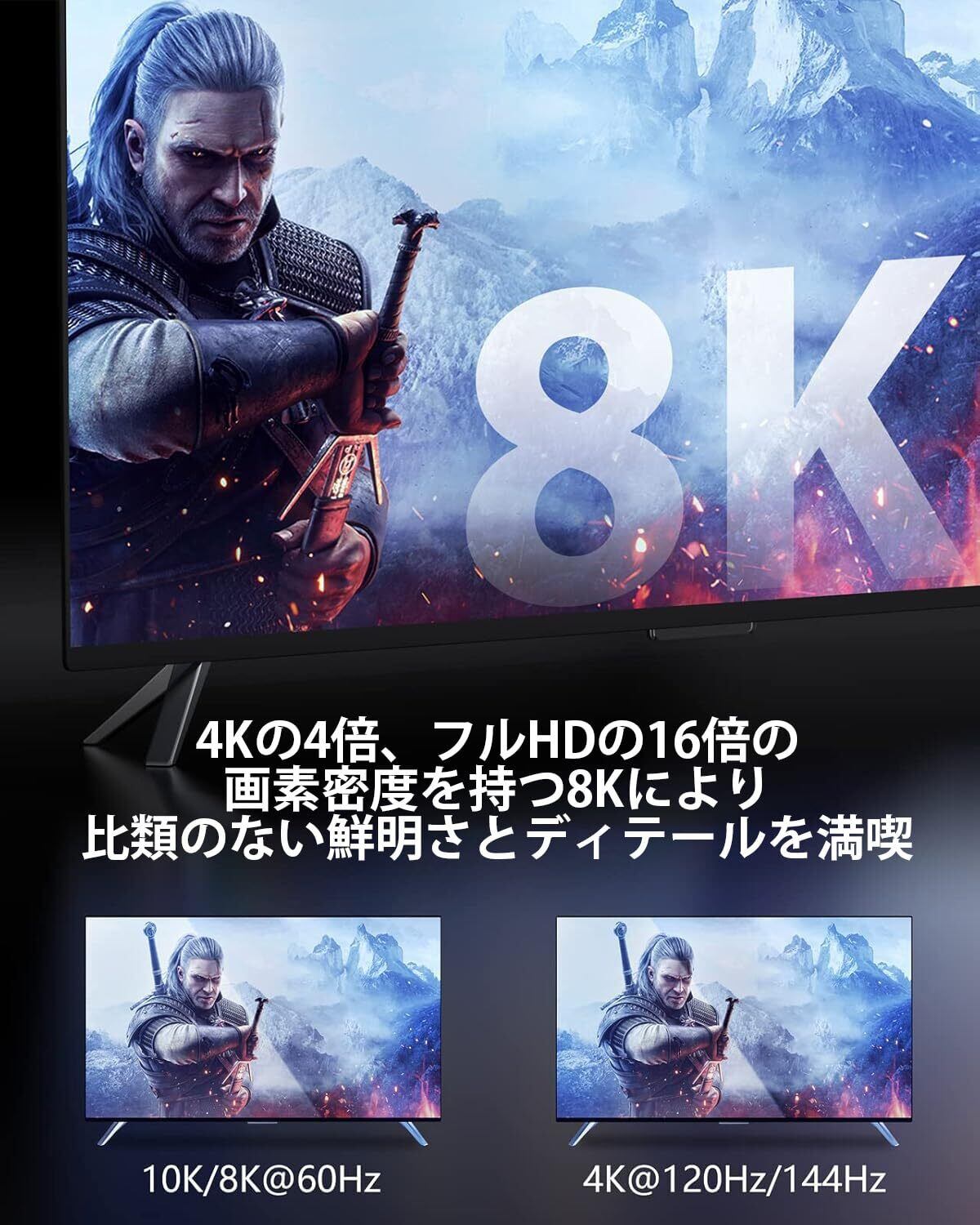 【HDMI 2.1規格】:HDMI 2.1仕様は、HDMIの最新のアップデートです。高いビデオ解像度とリフレッシュレート8K@60Hzと4K@144Hz 120Hzの解像度をサポートしています。ダイナミックHDRフォーマットもサポートされており、最大48Gbpsまでの帯域幅をサポートしています。また、30AWG銅線、三重錫シールドにより、Wi-Fiなどのワイヤレスサービスとの干渉を低減します。ケーブルには下位互換性があり、HDMIデバイスの既存のインストールベースで使用できます。HDMI 2.1だけではなく、HDMI 2.0/HDMI 1.4/HDMI 1.3/HDMI 1.2/HDMI 1.1規格準拠デバイス同士の接続にも対応できます。