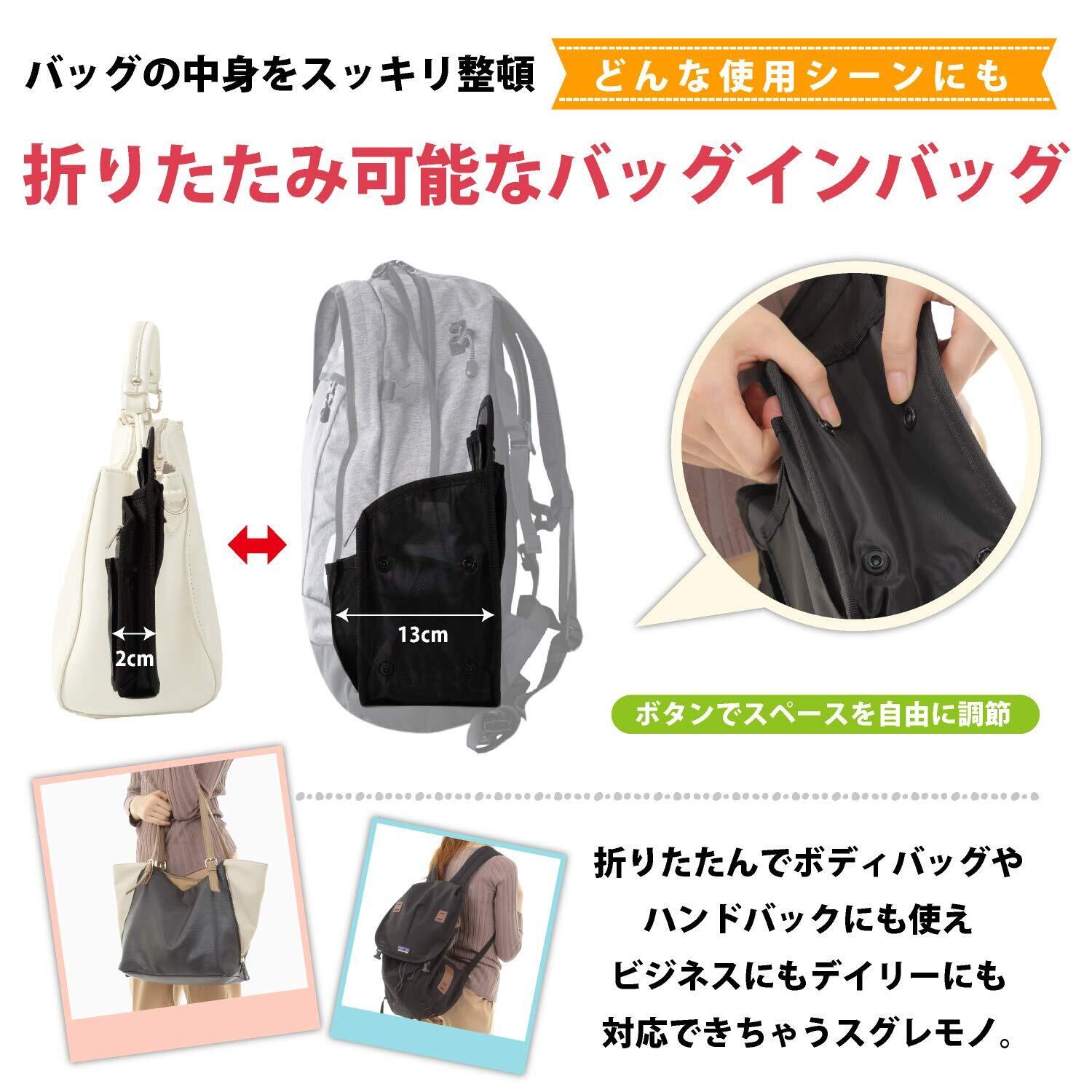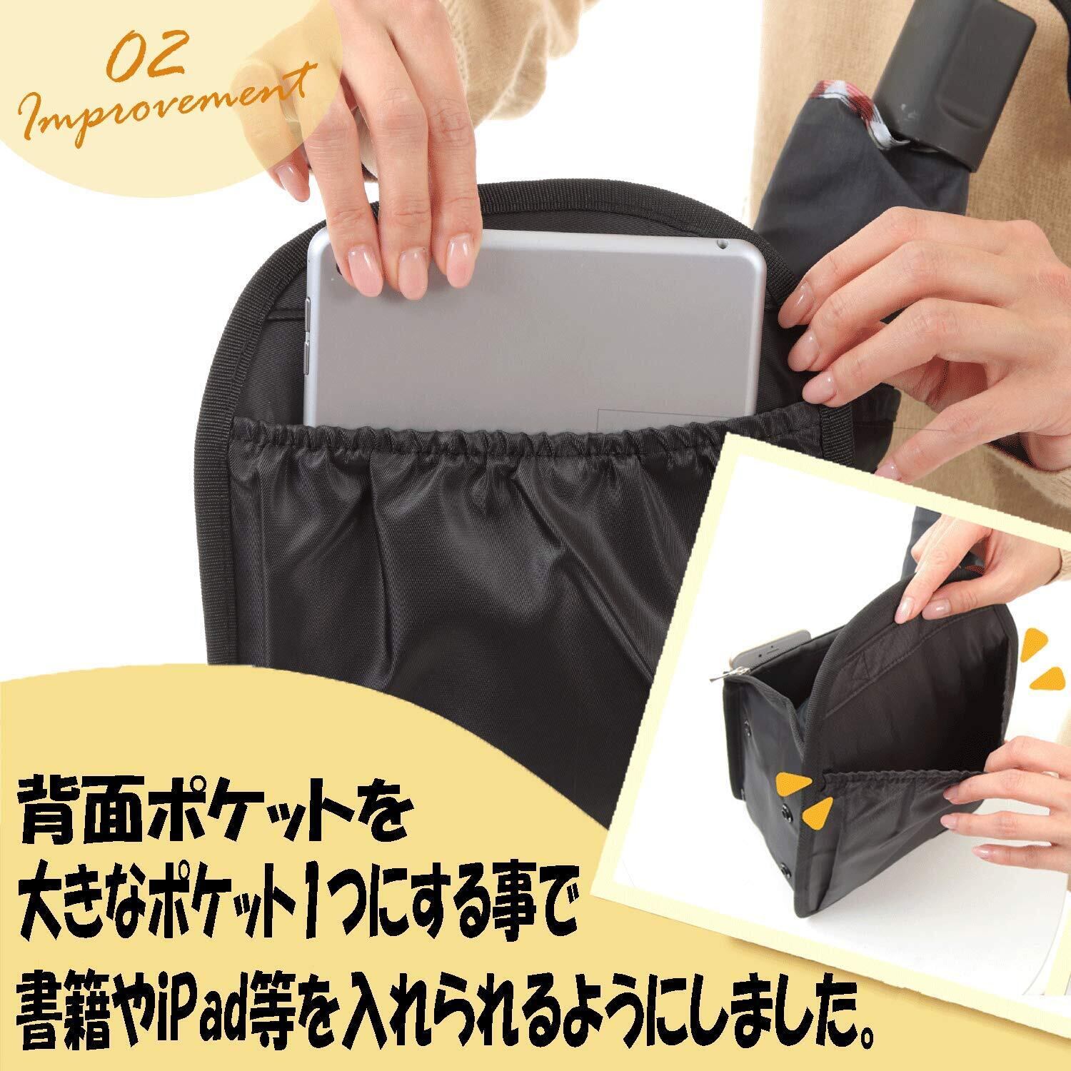お客様の声によりポケットを変更 上部のポケットを小さいポケット2つから大きなポケットに変更、背面ポケットを全面ポケットに変更、それにより、上部ポケットに入れる大きなスマホでも収容可能となりました。また、背面を大きなポケット一つにする事で、長財布、iPad、書籍等を入れてお使い頂けるようになりました。PP底板付きなのでより安定性も向上致しました。