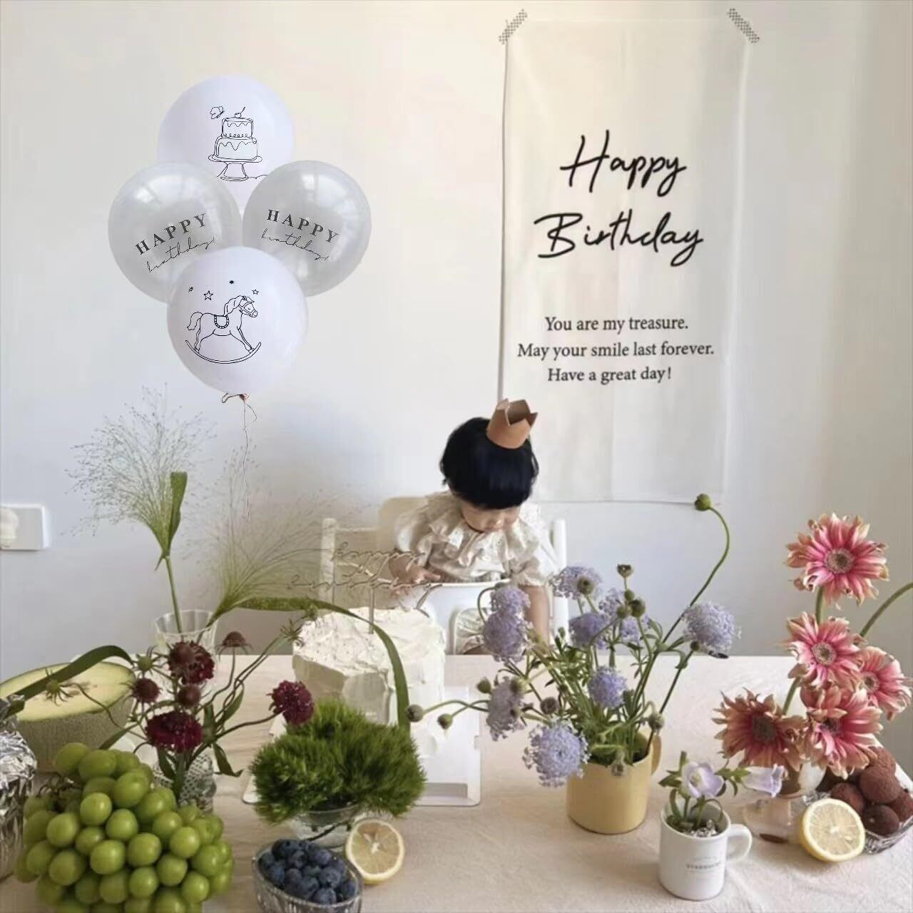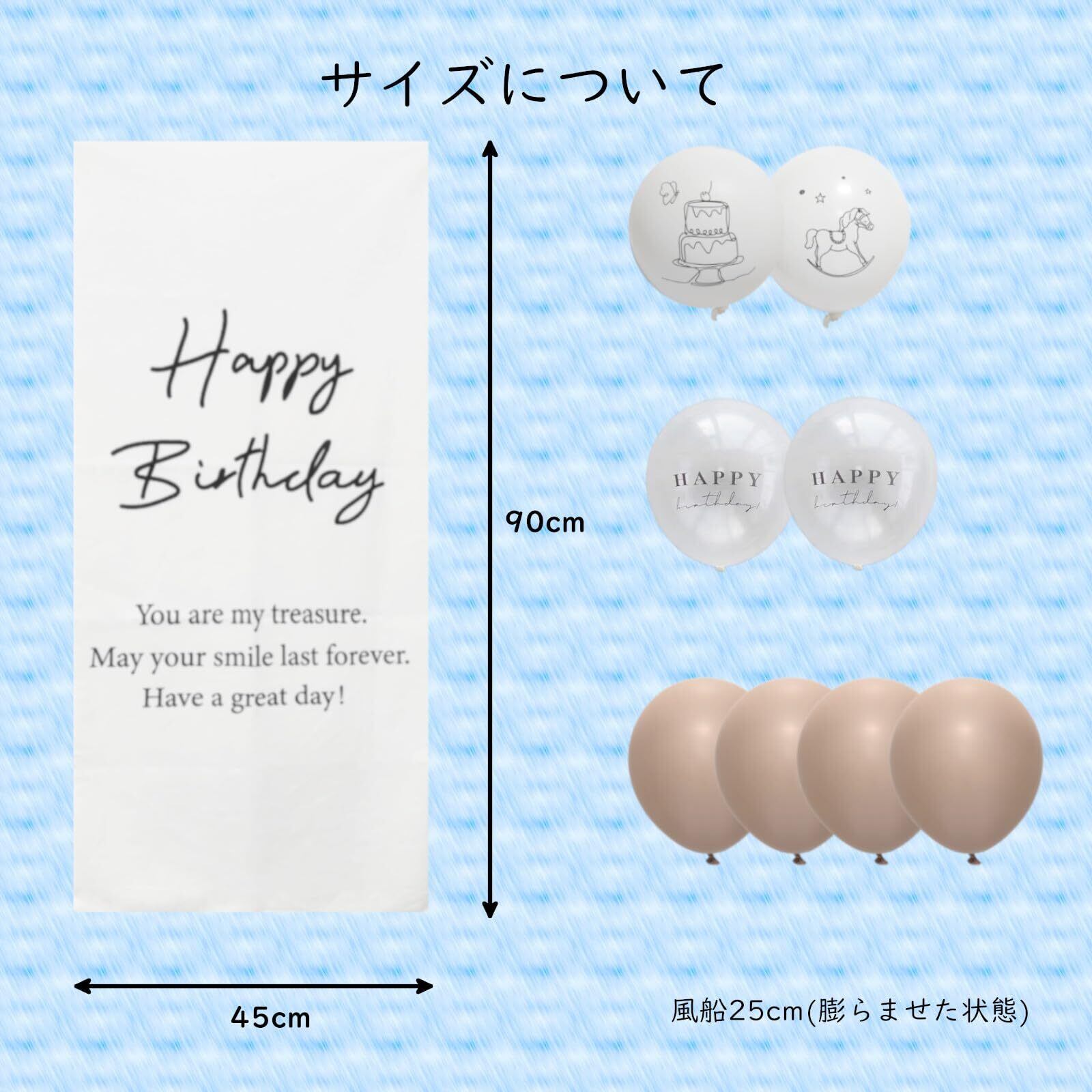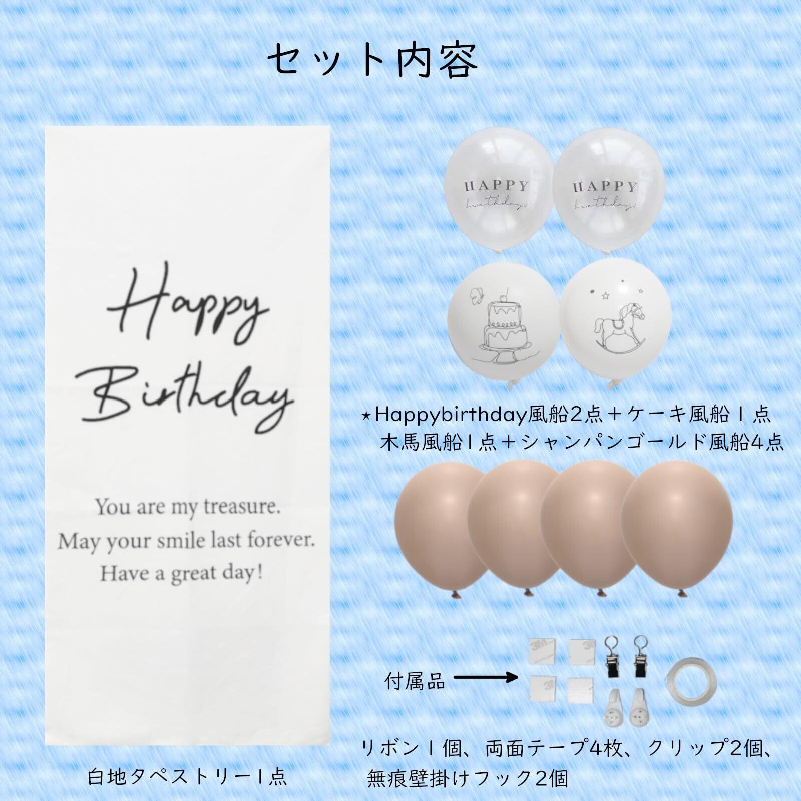 【セット内容物】:白地タペストリー1点+happybirthday風船2点+ケーキ風船1点+木馬風船1点+シャンパンゴールド色風船4点 ※付属品に押しピンありますので開封時針にご注意お願い致します。