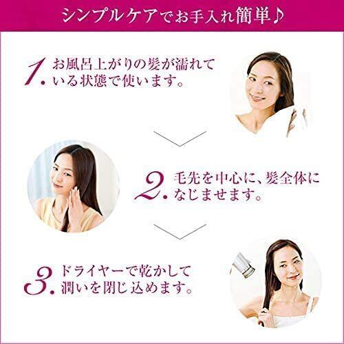 【使用方法】Step1.洗髪後、タオルで軽くおさえるようにして、余分な水分を拭き取ります。Step2.手のひらにヘアエッセンスを適量取り、毛先を中心につけた後、髪全体になじませます。Step3.根元から毛先に向かってドライヤーで乾かします。最後に冷風で仕上げるとツヤ感がアップします。
