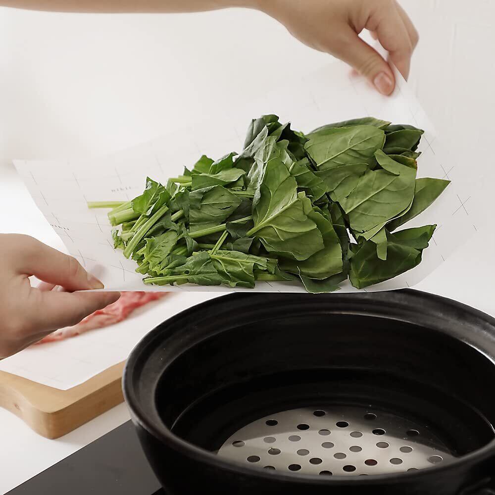 カットした食材をフライパンや鍋に移す際もシートを持ち上げれば簡単に移せます。