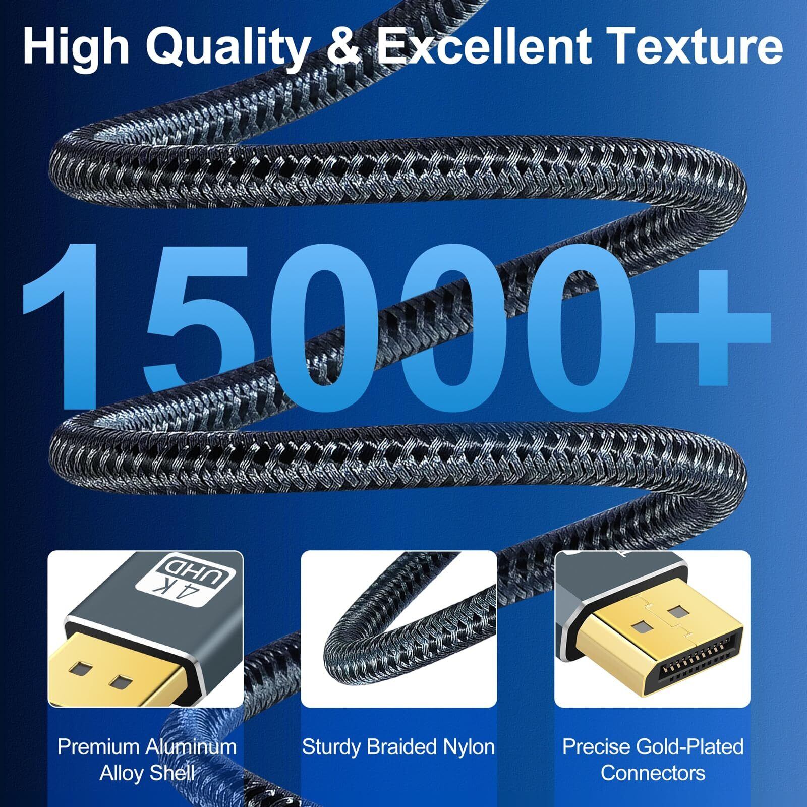【超耐久性】DisplayPort 1.2ケーブルは、高品質のナイロン編組シースを使用しており、5,000回以上の曲げに耐え、簡単に壊れることはありません。 このディスプレイケーブルは複数のシールドで設計されています。 24K金メッキコネクタと28AWG錫メッキ銅により、信頼性の高い干渉のないデータ転送を実現し、伝送の安定性を向上させます。