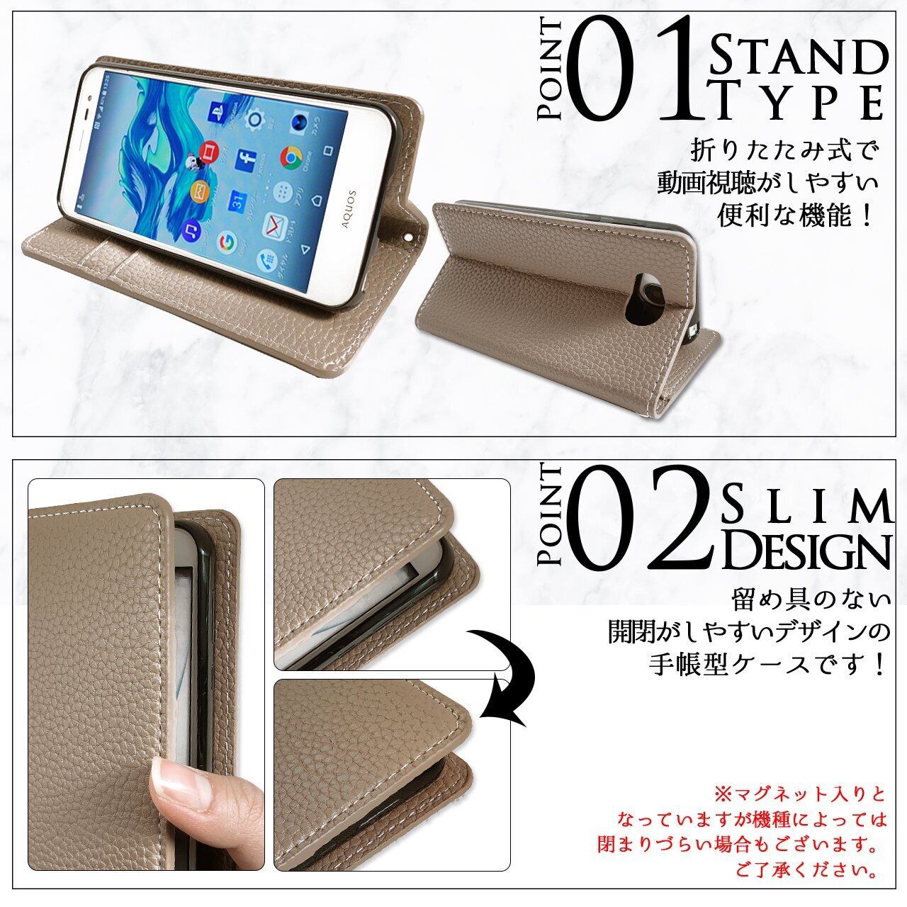 機種に合わせた開口部が開いております。※電源ボタン等はケースの上から押す仕様となっております。ご了承ください。手帳型ケースはスマホ本体より大きめの作りになっております。スリムなスマホをお持ちのお客様は幅が大きくなりますのでご了承のほどお買い求めください。