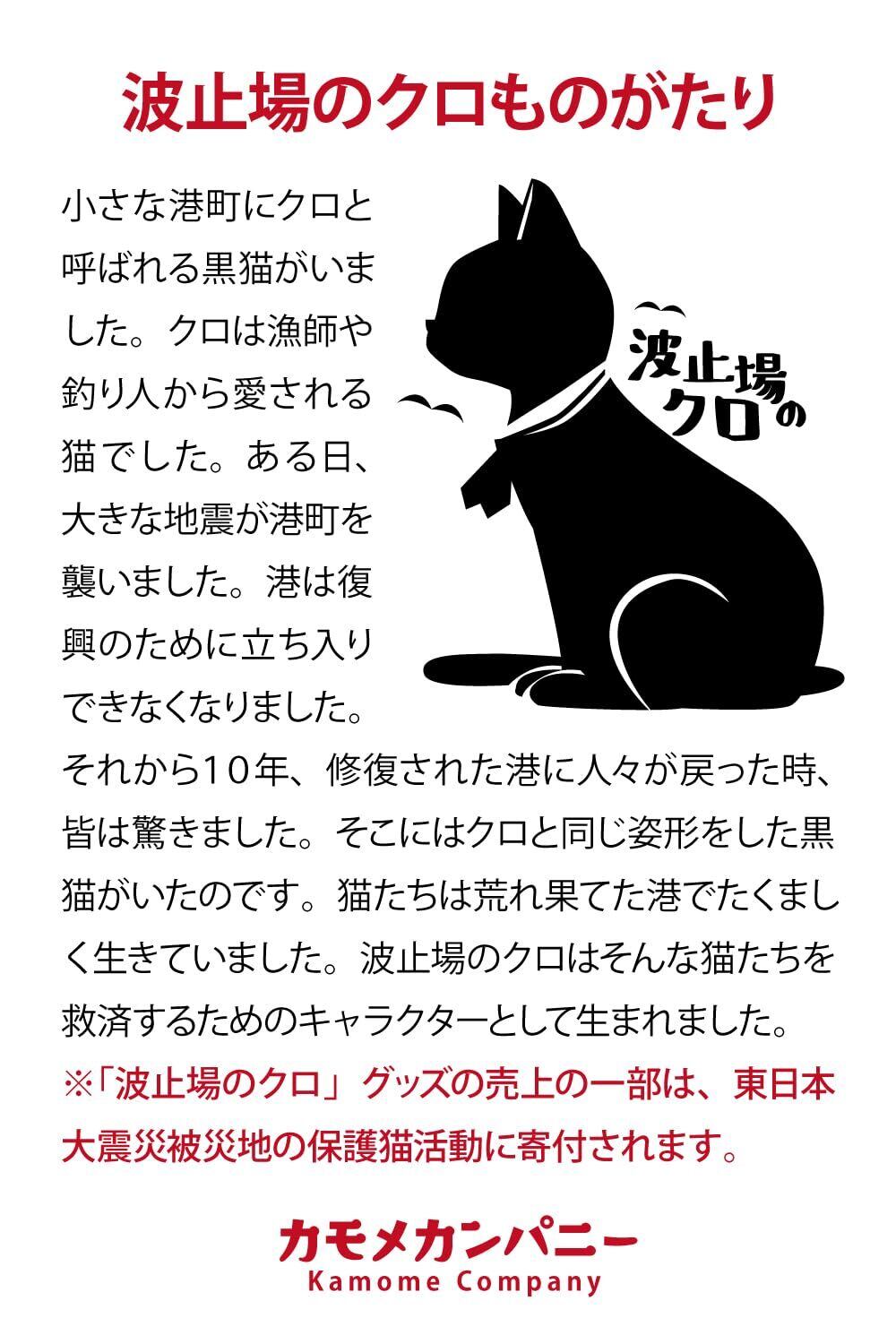 ◯波止場のクロ 東日本大震災で被害を受けた岩手県沿岸で生まれたキャラクターです。長らく閉鎖中だった漁港・波止場も10年の復興計画により次第に開放されています。漁船や釣り人の姿も戻るにつれ、港の猫たちも帰ってきました。そんな港町のたくましい猫をモチーフにしたのが「波止場のクロ」です。