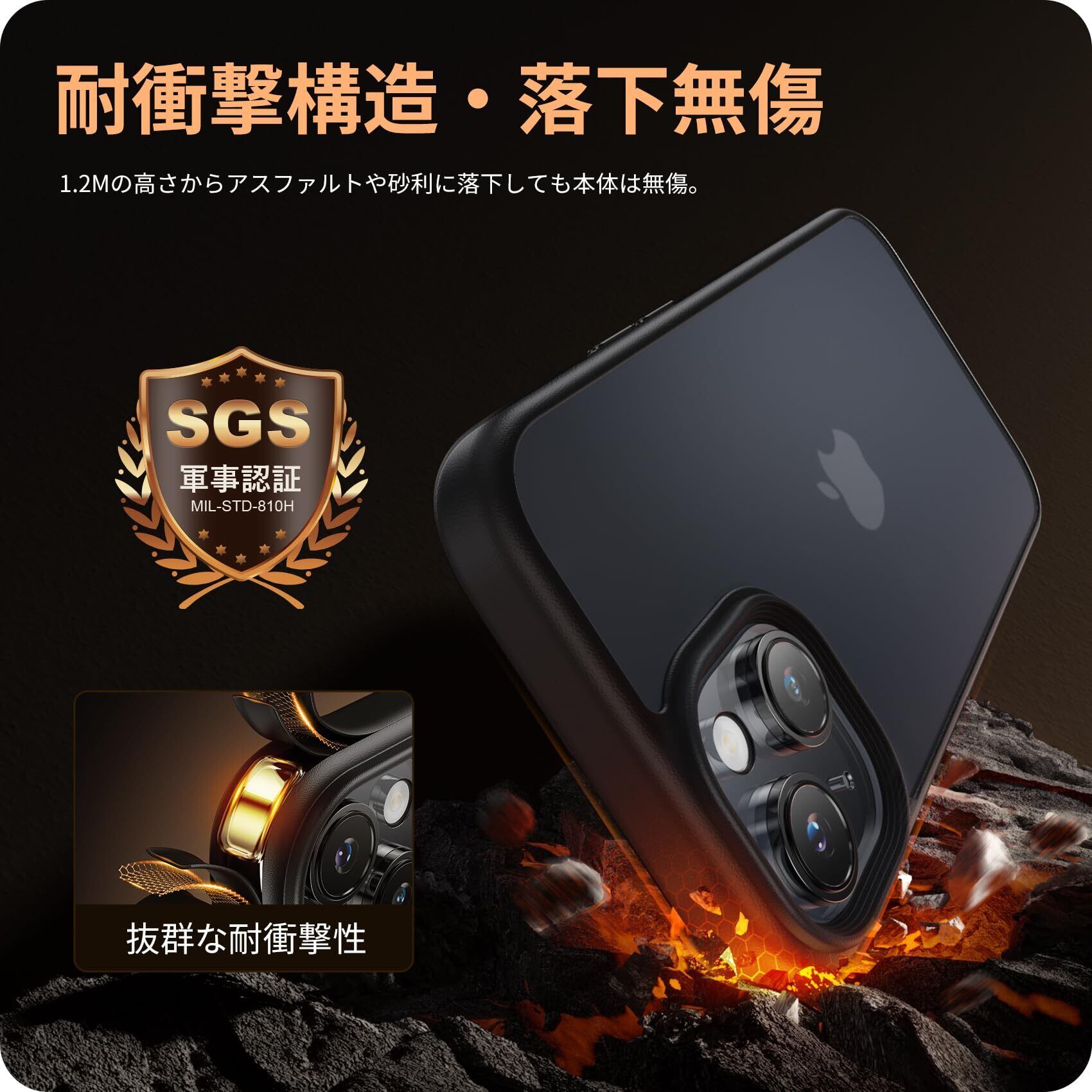 【米国MIL規格取得・耐衝撃性】世界で有名な米国防総省が規定する米軍採用品規格「MIL-STD-810H」に準拠。(認証番号:GZMR220802602301)。1.22mの高さからコンクリートの地面に厚さ5mmの合板を敷き、それぞれ違う角度から合計26回落下させても、本体は無傷です。高い耐衝撃性を誇り、iphone15plusを全方位からしっかりと守ります。
