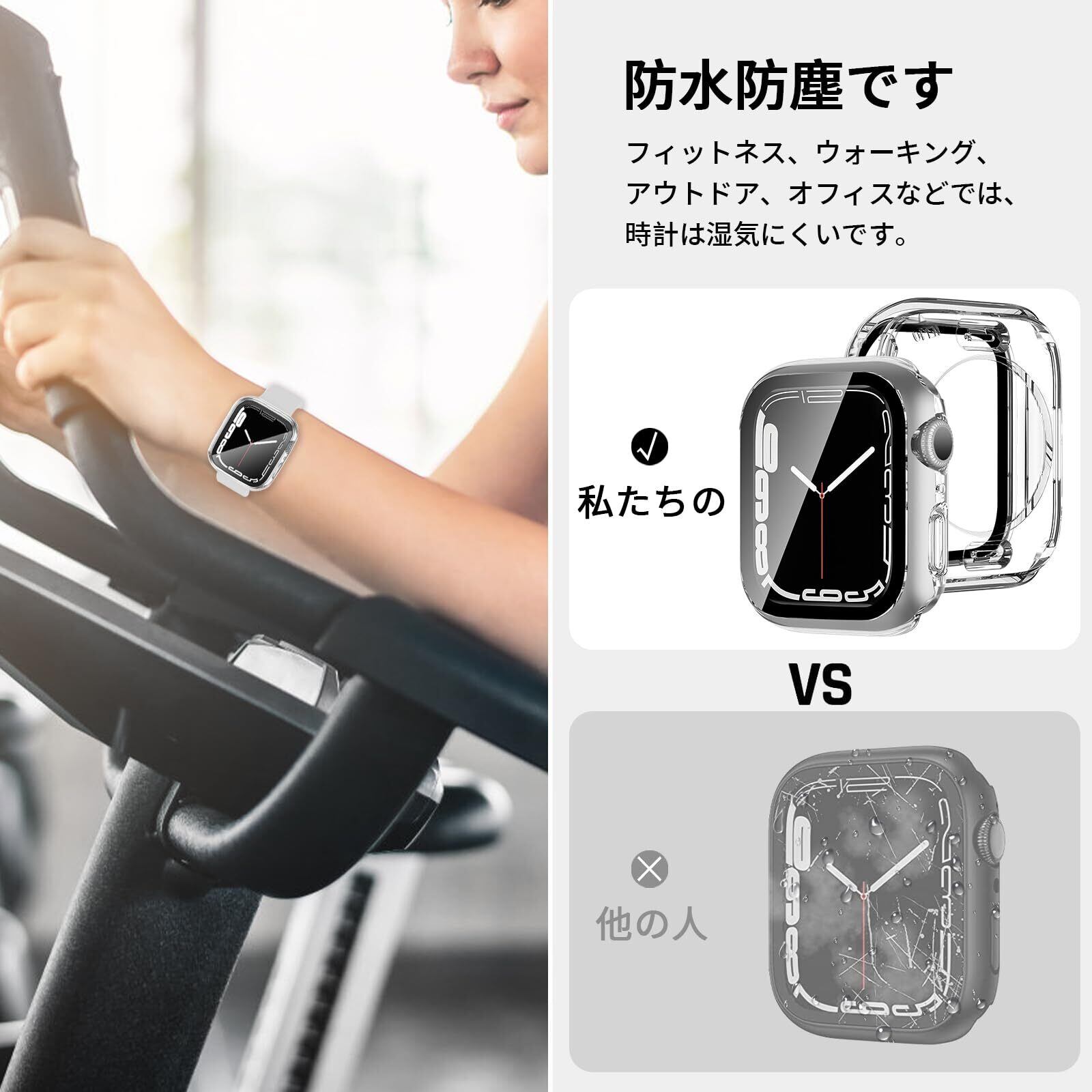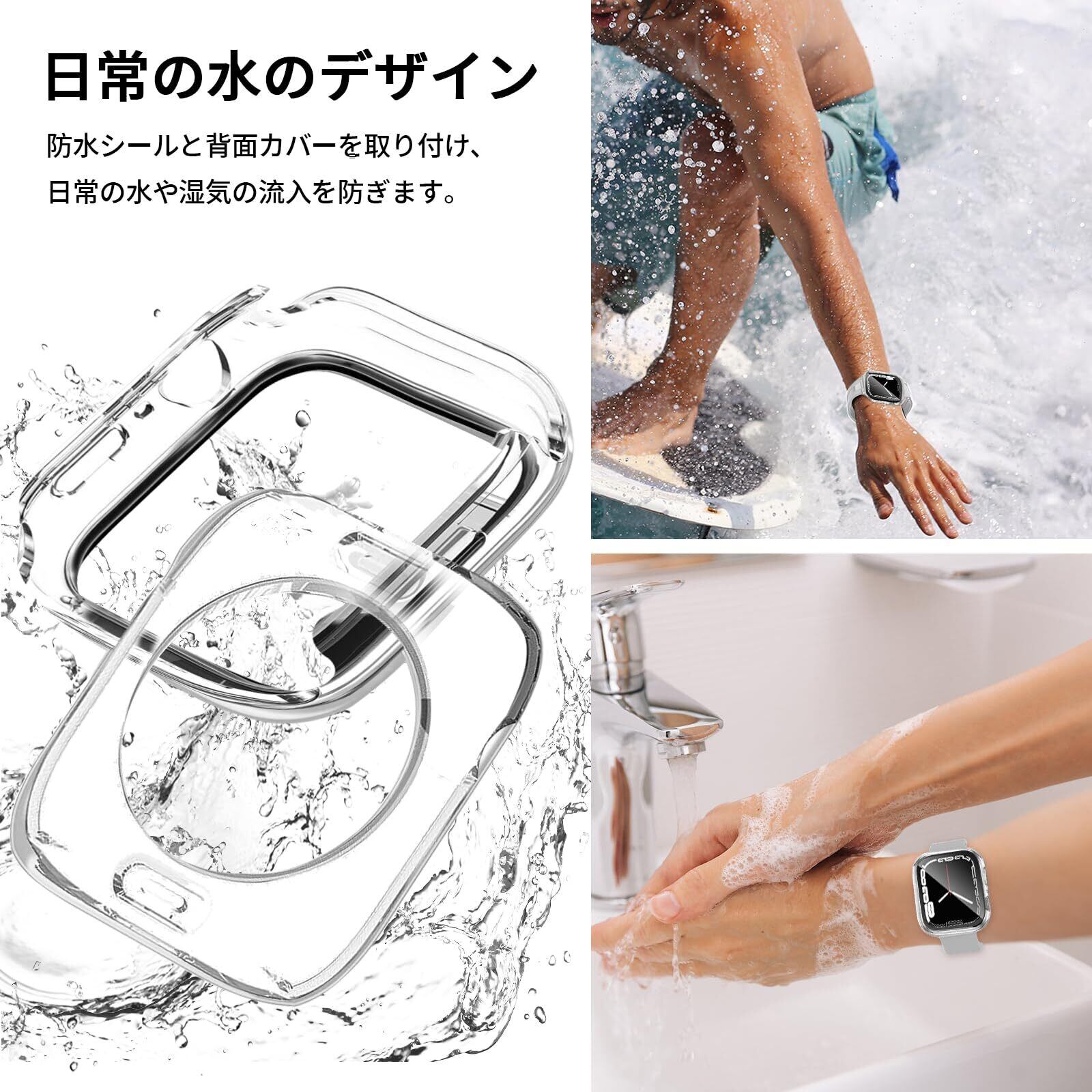 【360ど度 防水設計】Apple Watch ケース特殊加工による360ど度 防水設計により、 手を洗う時はもちろん汗をかいた時、シャワーを浴びた時にもかかわらずにアップルウォッチをご使用できます。 ※アップルウォッチ本来の防水性能を向上させるものではありません。プールや海などの水場でのご使用時はアップルウォッチの説明に従い、スキューバダイビング、ウォータースキーなど、水圧が高くなったり、所定の水深より深く潜るようなアクティビティはしないでください。