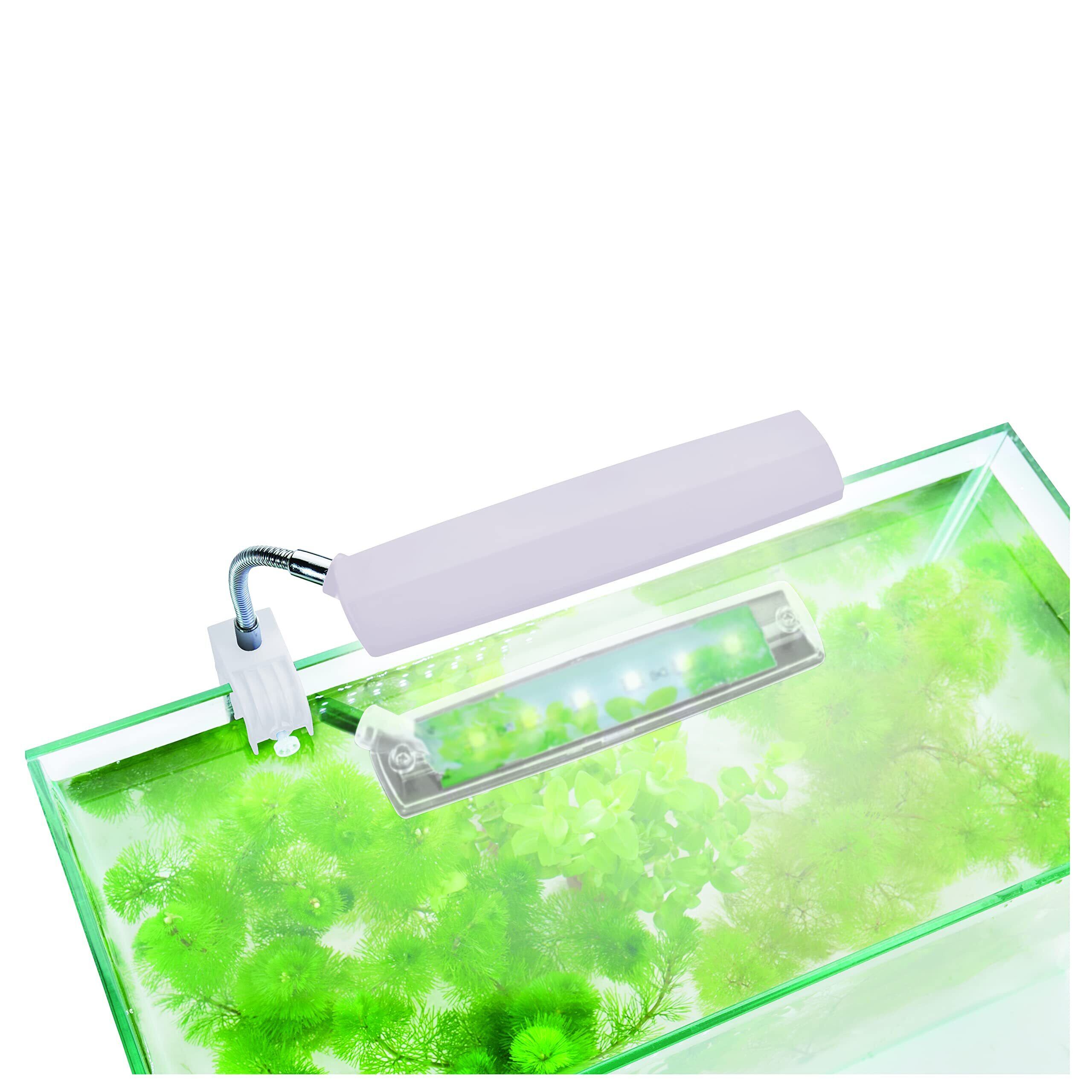 ハイパワー高輝度LED採用。明るく、鮮やかに。発光素子が3つ入ったハイパワーSMDLEDを使用。照射角度120度で水槽をすみずみまで明るく照らす。 魚や水草がきらめく白色光。 フレームレス水槽、枠付き水槽にも取り付け可能。ネジ式で簡単セッティング。LEDは、ON・OFFスイッチで切り替えが簡単。LEDを水はね、湿気などから保護するLEDカバー付き※カバーはついていますが、本製品は防滴構造ではありません。水滴がかからないよう注意してご使用ください。フレキシブルアームで角度・高さの調整が自由自在。メンテナンスも簡単に行えます。インテリアに合わせやすいホワイトカラー。