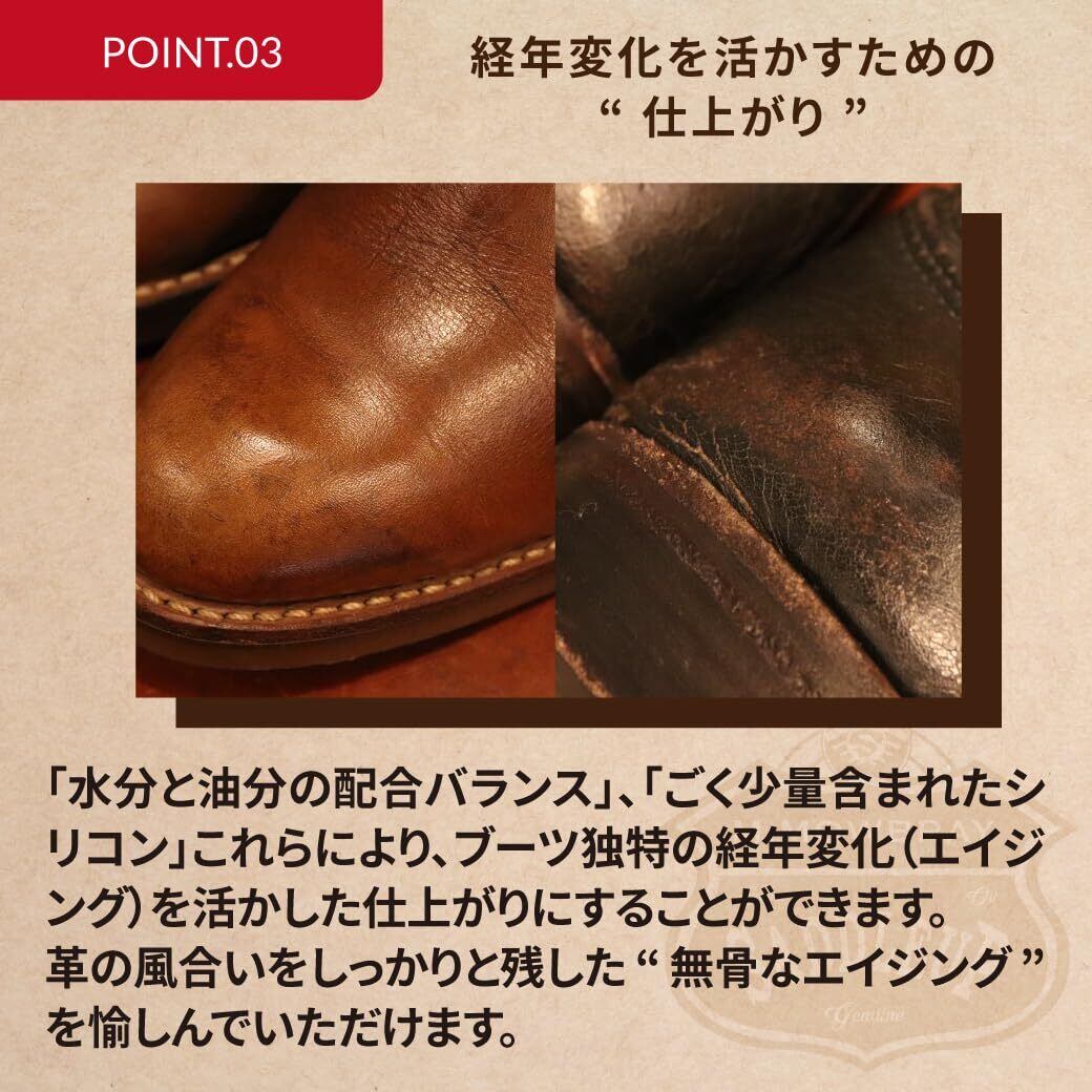 カルナバワックスとオイルを配合したエイジングをたのしむブーツのためのケアクリームです。経年変化した革の風合いを残し、あえてスレ傷を活かした「無骨なエイジング」をたのしみたい方にはエンジニアブラック、ブラックチェリー、シガーブラウンがおすすめ。革の色抜けや茶芯のエイジングをたのしみたい方にはニュートラルがおすすめです。補色、栄養、ツヤ出し効果がありながら、革の吸湿性や通気性にはほとんど影響しないクリームです。