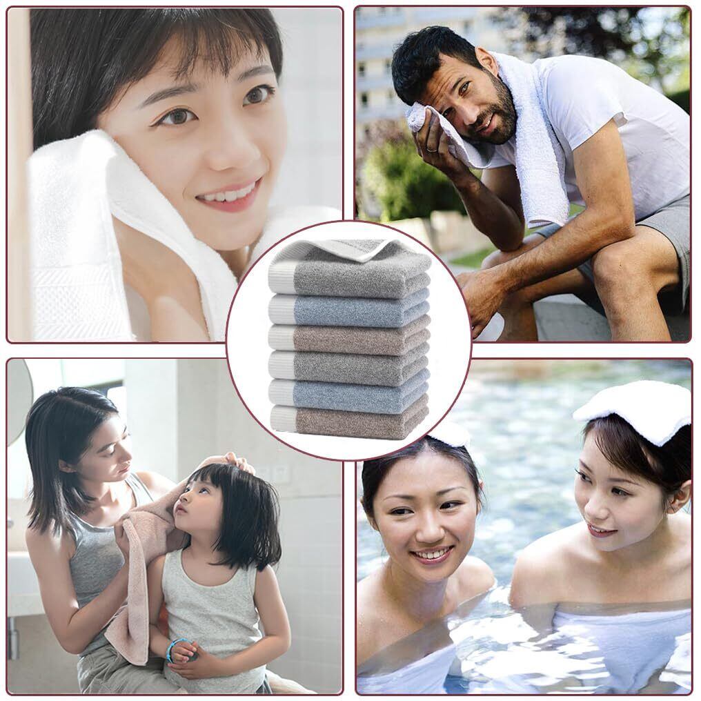 【フェイスタオル 6枚セット】素材:綿100%、サイズ:約33×74cm、重さ:約100g(1枚)、セット内容: グレー 2枚 + ブルー 2枚 + ブラウン2枚。