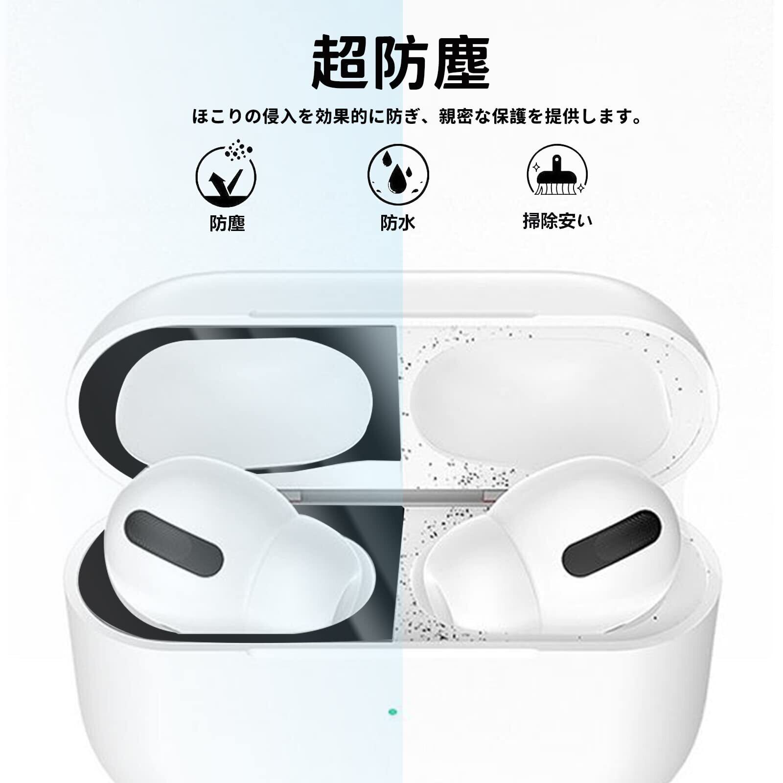 【取り付け方法】(1) 貼り付けガイドシートの透明フィルムをめくり、粘着面を上向きにします。(2) ダストガードを透明フィルムから取り出します。(3) ダストガードの接着面を上になるように貼り付けガイドシートに貼り付けます。貼り付ける際は、ダストガードが貼り付けガイドシートの一番外側に来るように注意してください。また、ダストガードを貼り付ける際にはねじれや歪みがないように貼り付けガイドシートに貼り付けてください。(4) ダストガードが貼り付けガイドシートの上に正しく位置づけられるように、エアーポッズプロの挿入口の位置に合わせます。(5) 位置が確定したら、貼り付けガイドシートの上からゆっくりとダストガードをエアーポッズプロの挿入口に貼り付けます。