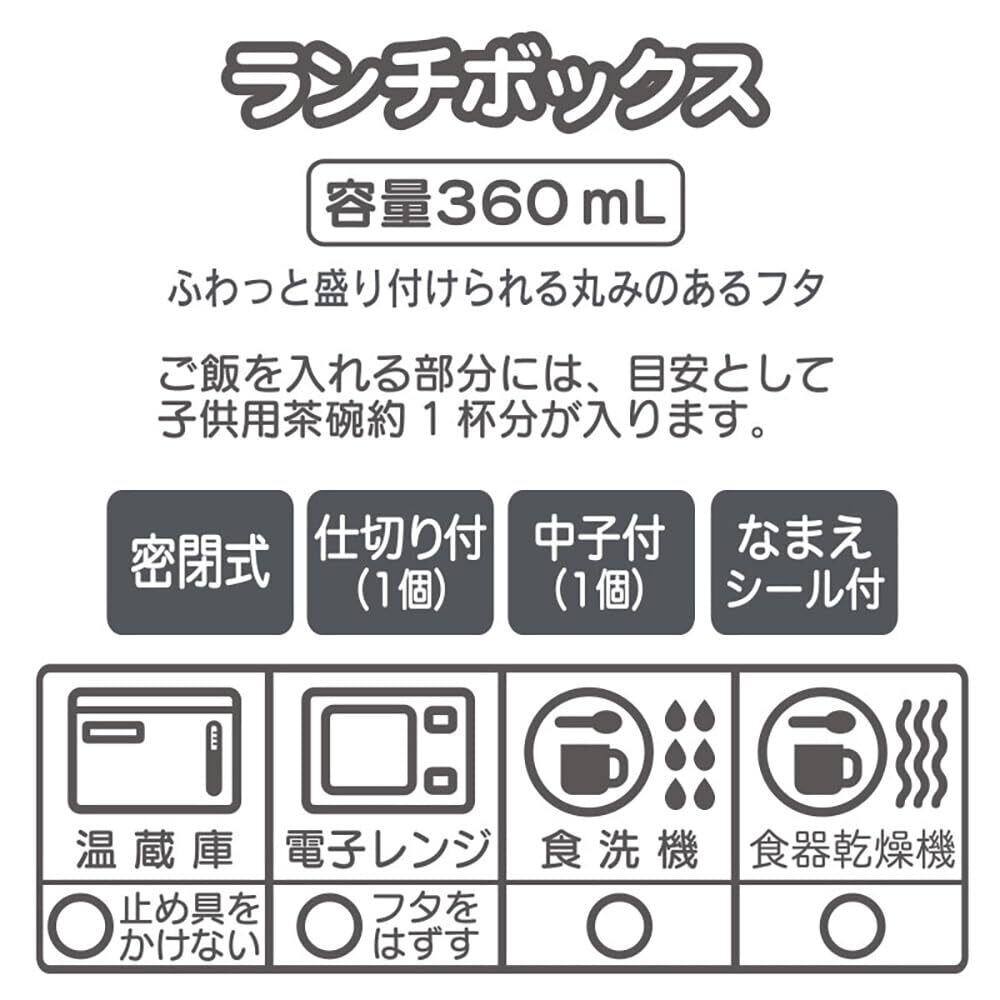 密閉式。中子・仕切り付き(各1個)。名前シール付き。抗菌。油汚れが落ちやすい加工。ご飯を入れる部分には、目安として子ども用茶碗約1杯分が入ります。電子レンジ対応(フタをはずす)。