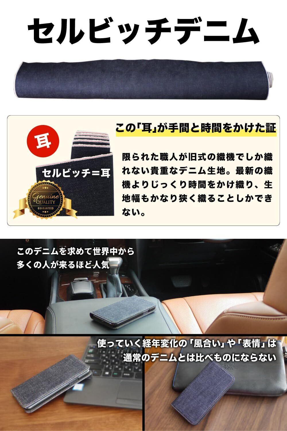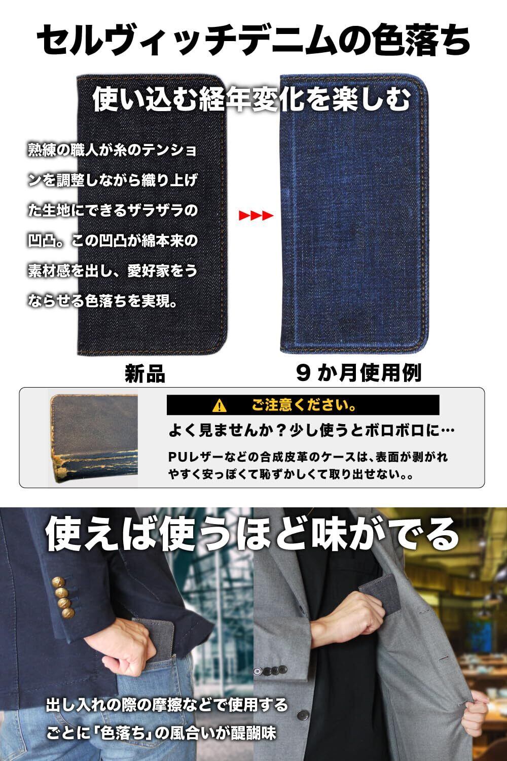 【デニム好きには、たまらない】あなただけの色落ちを楽しむ。デニム生地選びのため何度も生産地に足を運び、特に使い込む「色落ち」「風合い」「耐久性」が最高レベルのセルビッチデニムを使用した手帳型スマホケースです。 熟練職人の手による丁寧なものづくりが魅力。日本屈指のデニム産業のエリア三備産地で受け継がれた技術は、高いクオリティで知られ、世界からも一目置かれるメイド・イン・ジャパンのデニム素材。 このデニムを求めて、国内外から多くのマニアが訪れるほど。ジーンズ好きが魅了されるデニム。