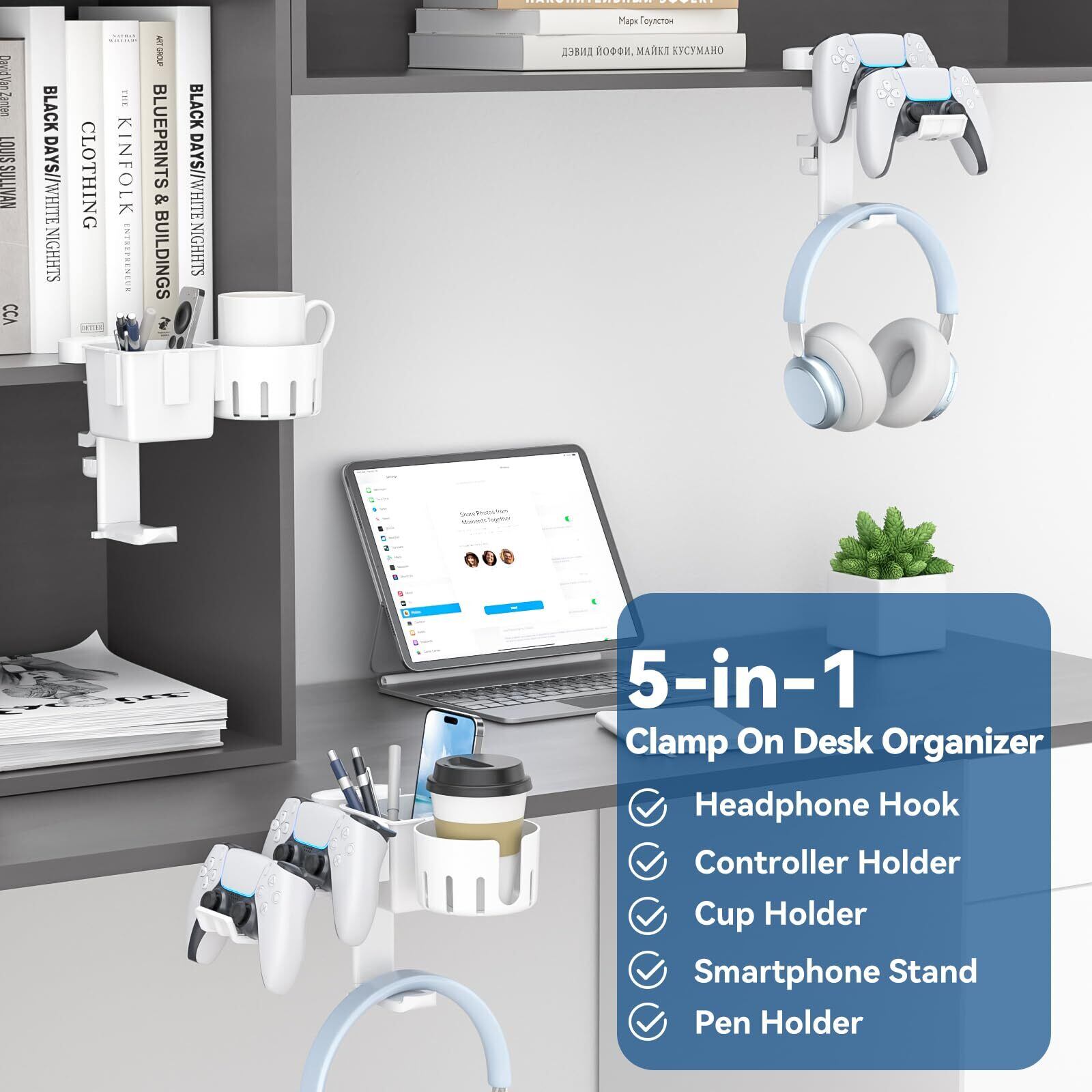 KDD 5 in 1デスクオーガナイザー—回転式ヘッドホンスタンド—取り外し可能なコントローラーホルダー—ペン立てとカップホルダー付き卓上収納がカップ、スマホ、ペン、コントローラーとヘッドホンに適用。(白い)
