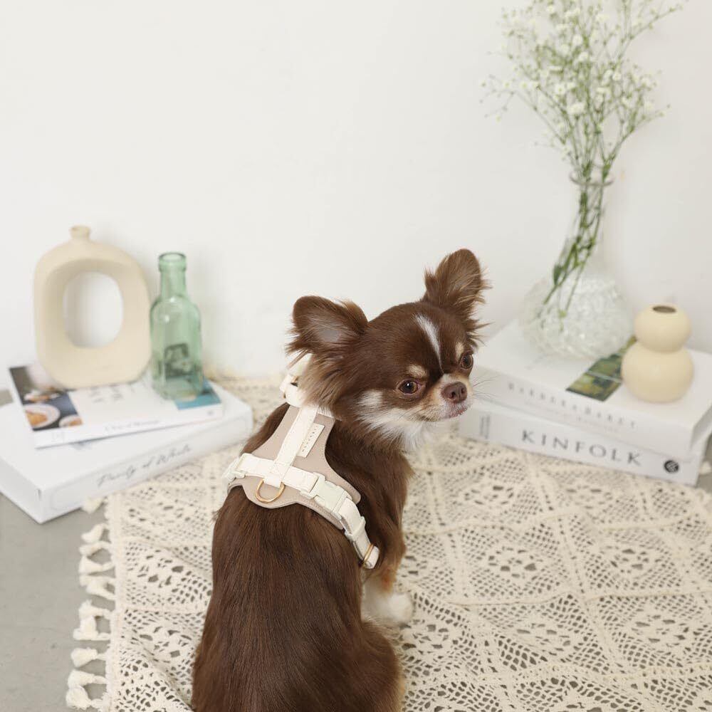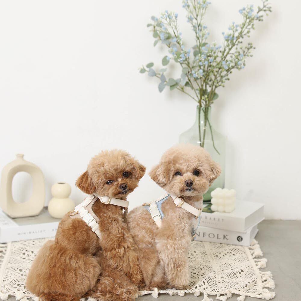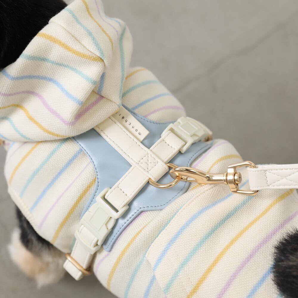 【シンプルなデザインで使いやすい】優しいカラーリングのPUレザーを使用したリード付きのハーネス。シンプルなデザインの為、どんなお洋服にも合わせやすいアイテムです。品のあるマットゴールドのパーツがおしゃれにまとまります。