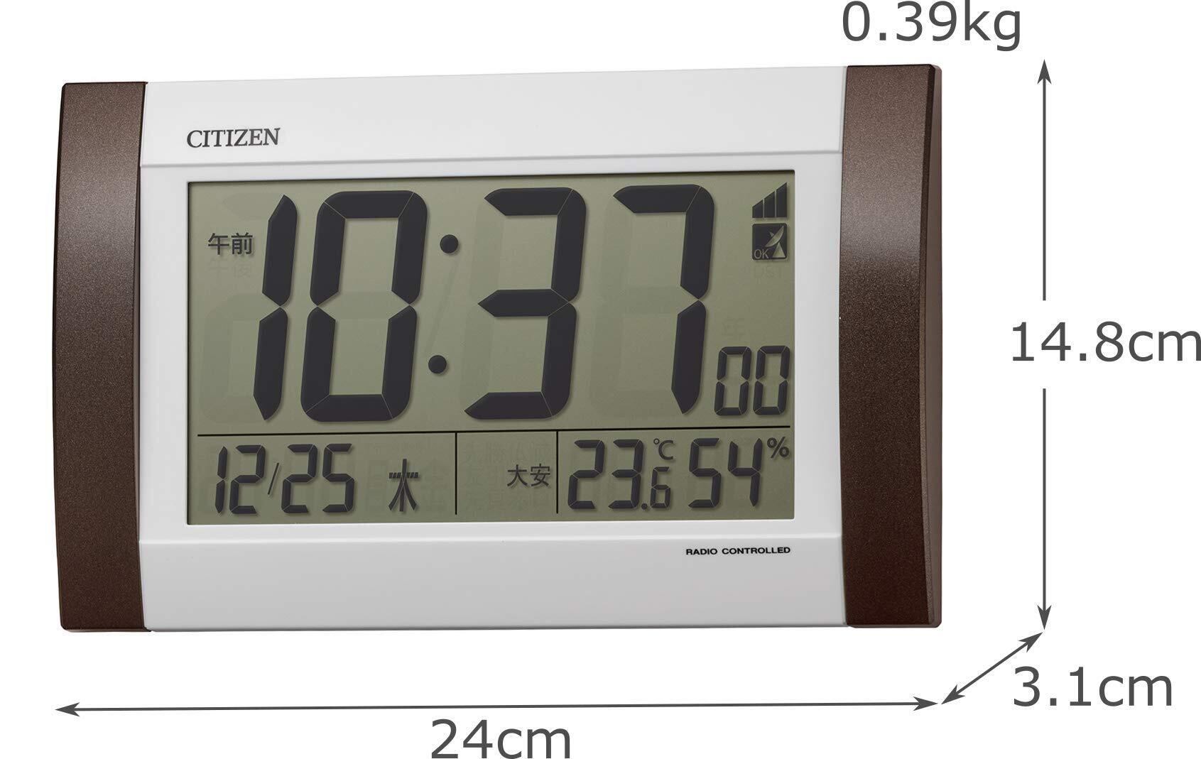 リズム(RHYTHM) シチズン 掛け時計 目覚まし時計 電波時計 デジタル R188 置き掛け兼用 カレンダー 温度 ・ 湿度 表示 茶 24.0×14.8×3.1cm CITIZEN 8RZ188-006