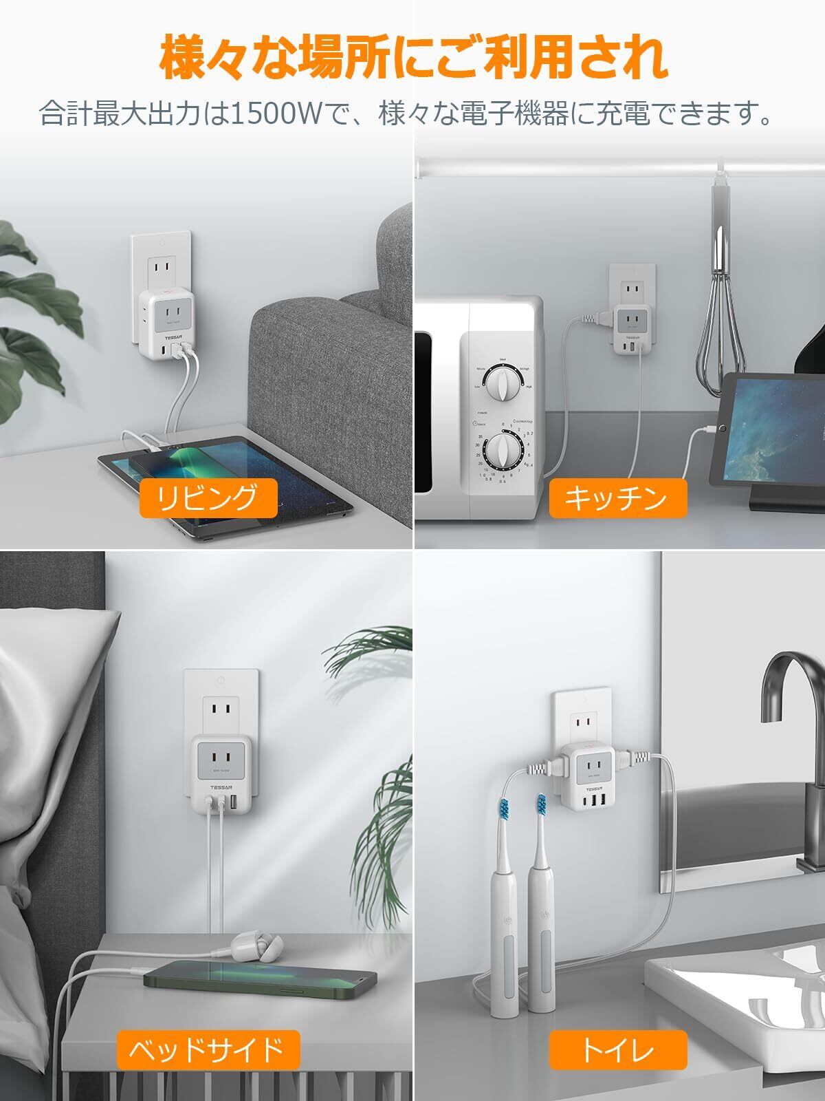 【多場所ご利用され】従来の伝統的なこんせんと たっぷと違って、type-cポート及びtype-aポートが同時搭載している壁直差しタップです。また、1500Wの合計最大出力で、宅内のリビング、キッチン、ベッドサイドやトイレなどの様々な場所にご利用頂けます。違った場所に複数の電子機器に充電したい場合、これ一つの分岐コンセントがあれば、十分です。ご注意:日本国内のみご使用できて、海外での使用は禁止です。