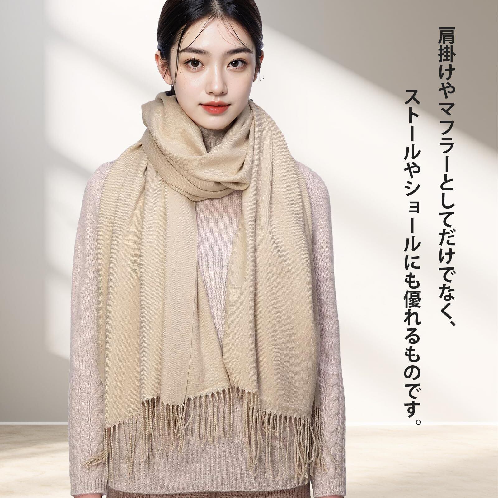 巻アレンジはもちろん、羽織りにも膝掛けにも使える。カシミヤタッチなので、ウールが苦手な方にもオスス