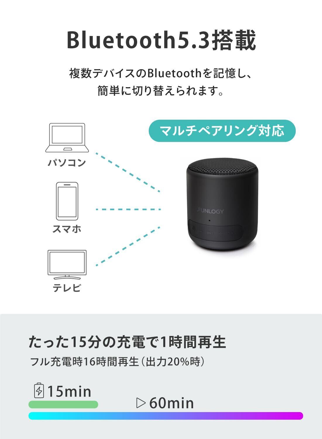【人気のbluetoothスピーカー】bluetooth(ver.5.3)を搭載した小型のポータブルスピーカーです。お手持ちのスマートフォン、パソコンと接続してワイヤレススピーカーとして使用できます。【クリアな音声】低音域から高音域まで、幅広い音を表現できるフラットな周波数特性。音のひずみを抑え、こもりにくさにこだわった音質です。一つひとつの音がクリアで聴き取りやすく、歌詞やセリフなどがよく通ります。