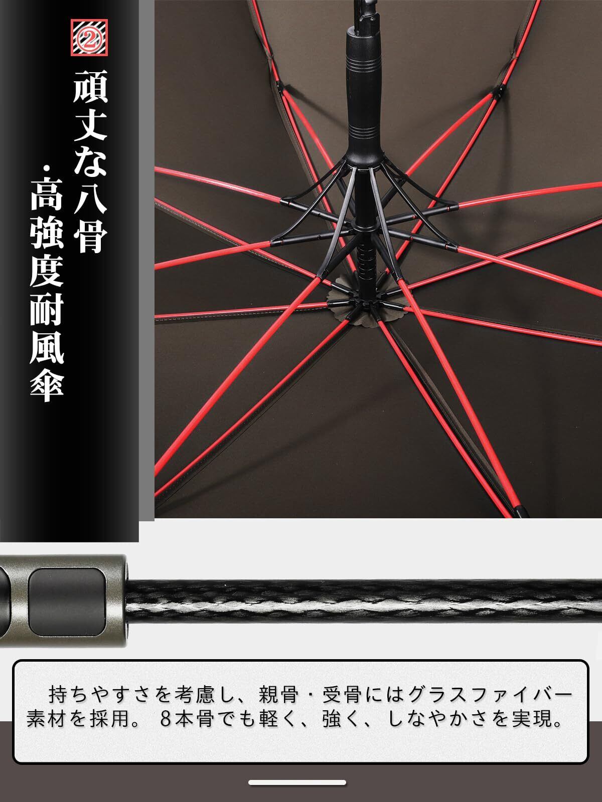 【豪雨&台風対抗の長傘】:わざわざ台風、暴風雨の天気の為に工夫を凝らして設計した耐強風の傘骨となります。強い風にあおられても心強くて安心できる男性専用の紳士傘です。傘骨は柔軟で丈夫なグラスファイバーを採用し、二重構造に出来上がったので今までに無い強度と耐久性を実現しました。かなり耐久性に優れ、暴風雨、台風の天候でも容易に割れたり折れたりする心配がありません。傘の部分が強風で裏返っても元に戻ります。安易に折れたり曲がったりする心配ありません。