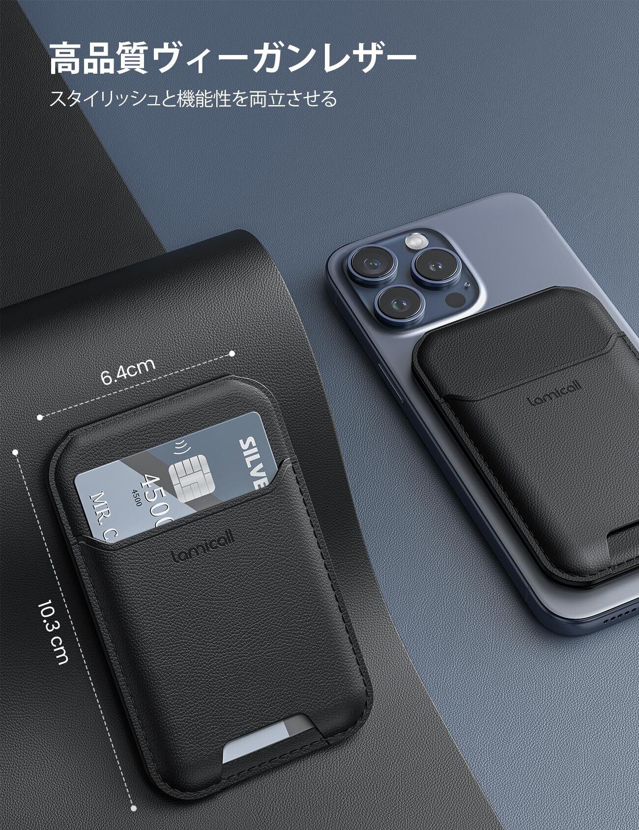 [Lamicall] 重さ改良 MagSafe対応 カード ケース スマホ スタンド : 3枚収納 magsafe 財布 マグセーフ ウォレット マグネット カード ホルダー カード収納 ヴィーガンレザー カード入れ 取り外し可能 角度調整 スタンド機能 財布 iPhone 16e 16 15 Plus pro pro max/14/13/12 に対応 ブラック