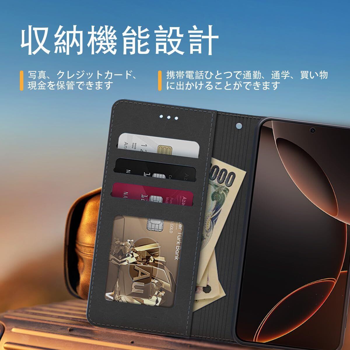 【収納機能、横置きスタンド機能デザイン】スタンド機能が付いて,横向いて斜めに立てて,お好きな角度を調整できます、動画鑑賞や読書なども楽しめます。内側に実用性のカード入れポケット×3、内側ポケット×1、カード類、現金、名刺、免許証入れなどを収納でき、通勤、通学、旅行に便利です。マグネットが内蔵されているので、ベルトがなくてもフタがぴったり閉まります。外出するときはいつも携帯電話を持ち歩くだけです。