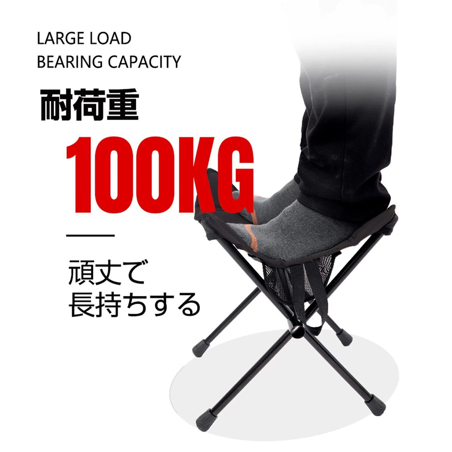 【耐荷重約100㎏・長持ち】椅子座面は丈夫で耐久性のある600Dオックスフォード生地を採用し、フレーム部分は十分な強度を有しているA6061アルミニウム合金で作られています。耐荷重およそ100㎏、頑丈で安定性のあるアウトドアチェア!